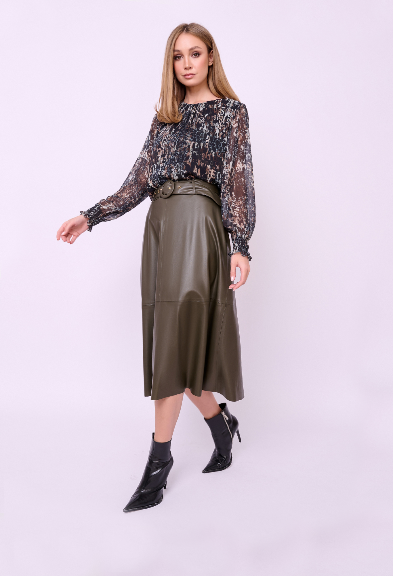 Блуза из шифона с абстрактным рисунком свободного покроя с округлой горловиной, длинными рукавами на резинке. Длина по спинке: 66 см.
