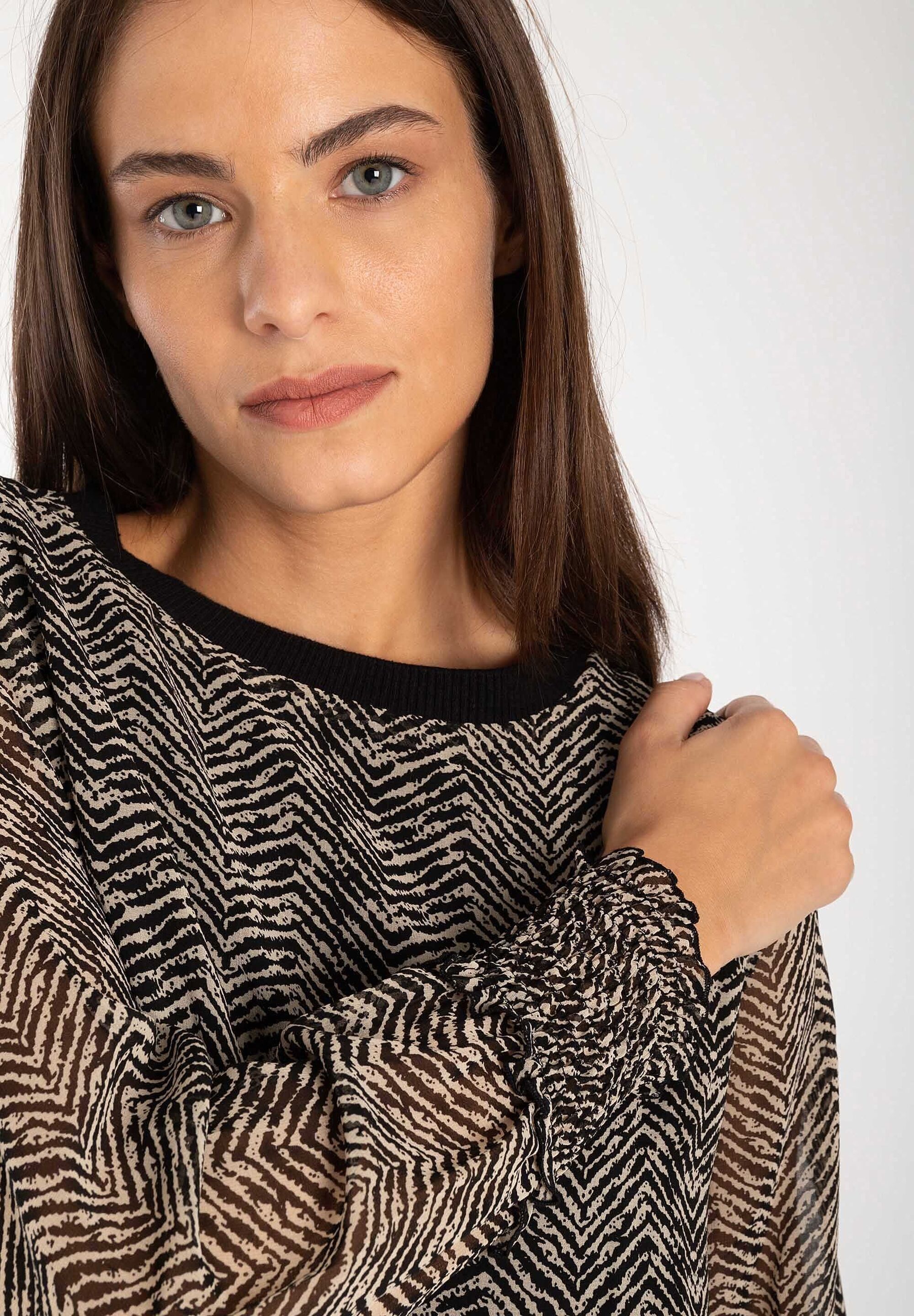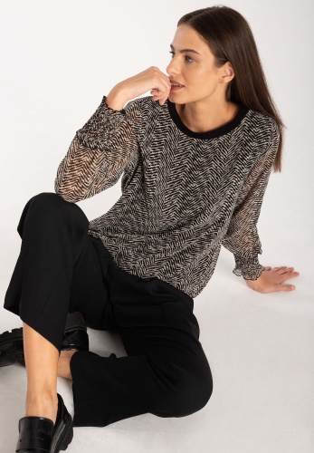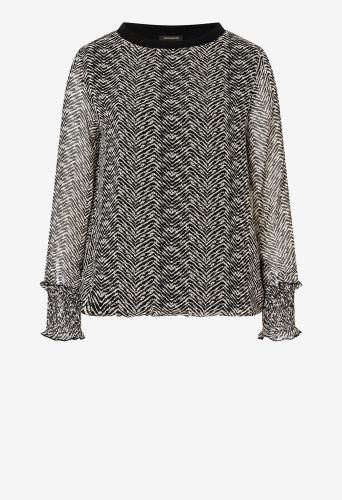 Струящаяся шифоновая блузка с двухцветным зигзагообразным принтом и спортивными ребристыми манжетами на вырезе одинаково хорошо смотрится с денимом с покрытием или классическими деловыми брюками. Длина по размеру 42 - 62 см.