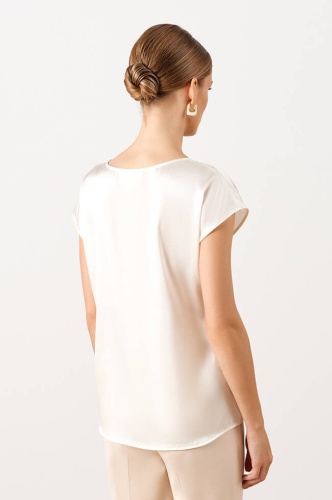 Элегантная топ-туника, выполнена из шелкового полотна. Овальный вырез горловины. Спущенная линия плеча с небольшими цельнокроеными рукавами. Спереди выполнен дизайнерский принт «Полевая россыпь», декорированный стразами.