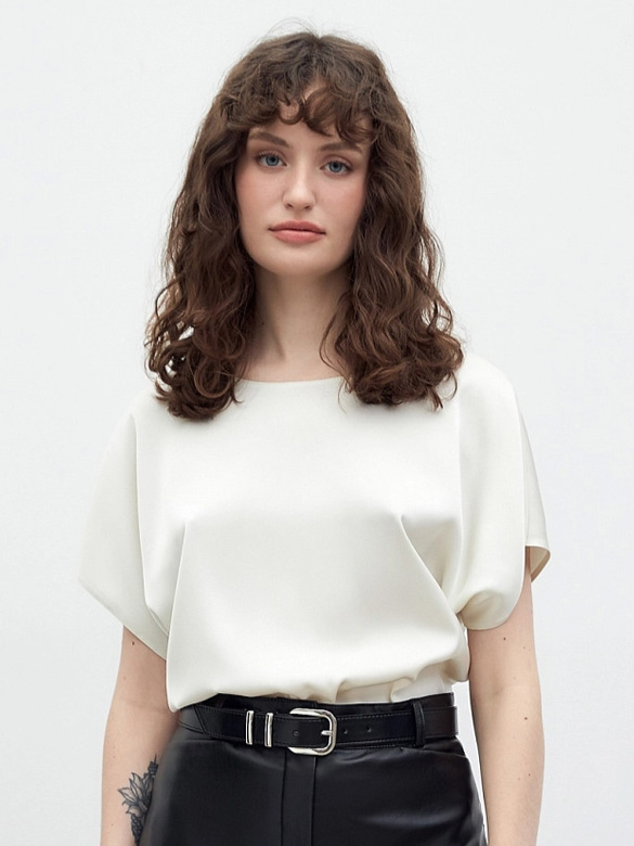Классическая прямая блуза из блузочной атласной ткани в молочном цвете с горловиной лодочкой.