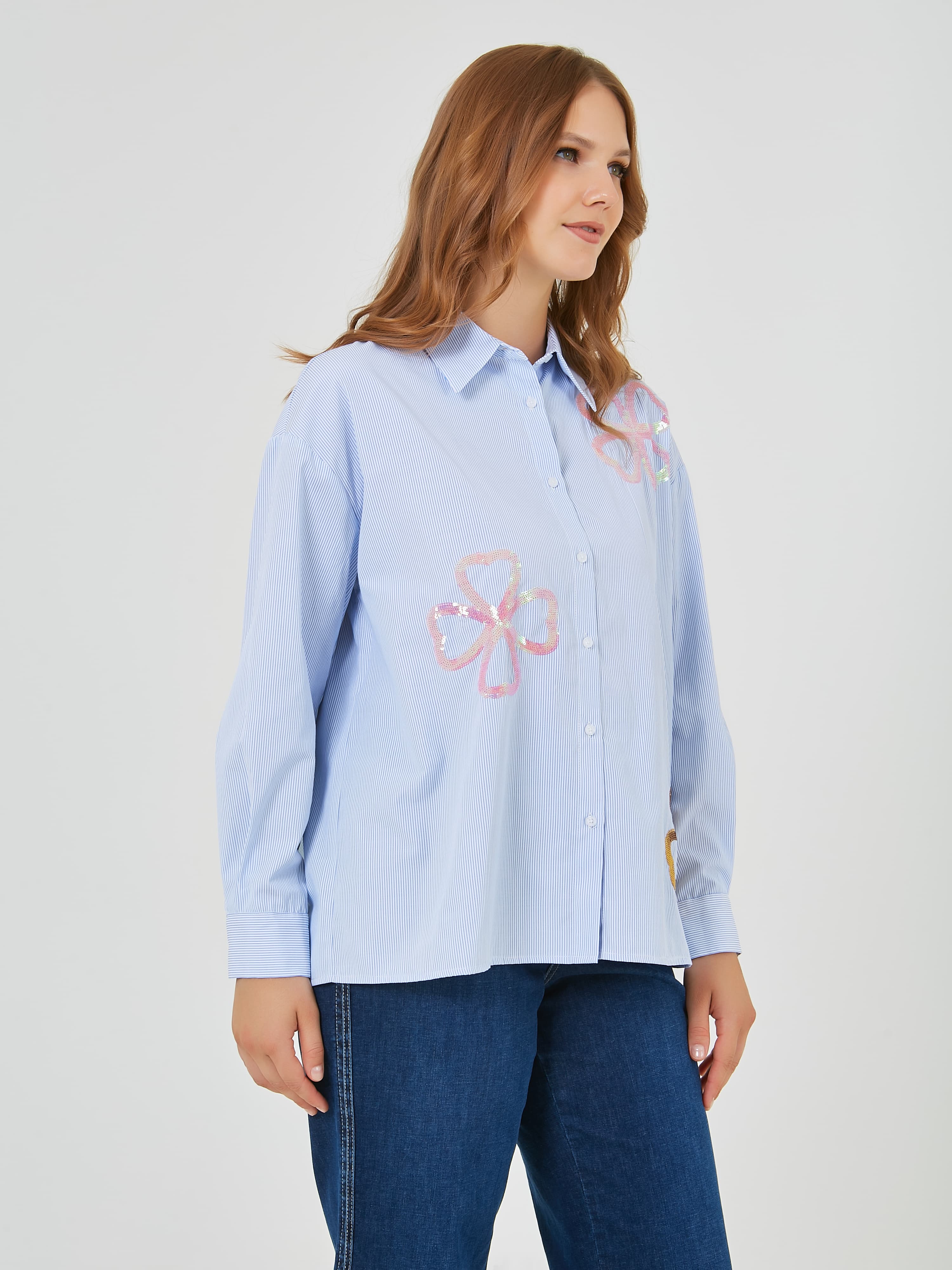 Классическая рабашка на пуговицах в вертикальную полоску. Украшена цветами из пайеток разных цветов. Коллекция Весна-Лето 2025. Капсула "Самарканд". Параметры модели: 95-64-101, рост 175, размер 44-46