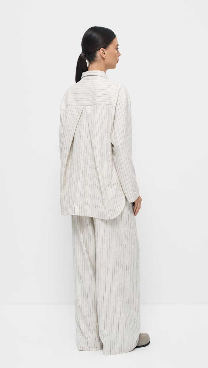 Блуза выполнена из ткани в полоску с содержанием льна, что придает изделию натуральность и текстурность. Цвет "льняной пергамент" добавляет модели нейтральности и универсальности.