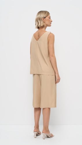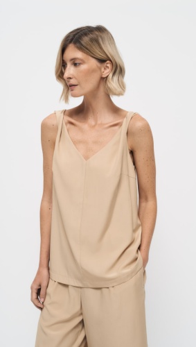 Основной материал – район, который искусно воспроизводит свойства натурального шелка. Этот материал славится своей мягкостью, гладкой поверхностью и отличной драпируемостью, что делает его идеальным выбором для создания легких и воздушных изделий. Цвет рафия добавляет блузе естественности и нейтральности, позволяя легко комбинировать её с другими элементами гардероба. Силуэт прямой, свободное прилегание. V-образный вырез горловины формирует четкий геометрический контур, способствующий визуальному удлинению шеи. Перекрученные бретели добавляют оригинальный штрих к общему образу, выделяя блузу среди аналогичных моделей.
