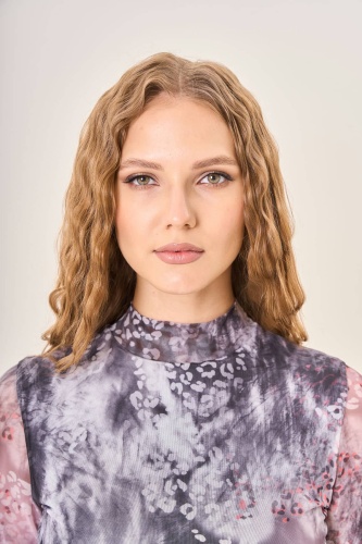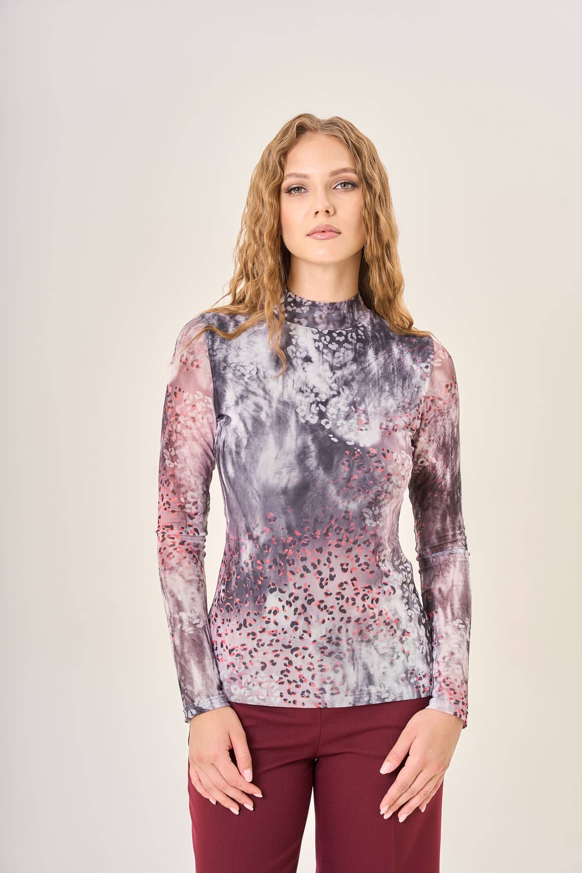 Женская облегающая блузка с длинными рукавами и воротником-стойкой. Сложная цветовая гамма с размытыми пятнами серого, белого и розового оттенков создает глубину и выразительность. Мелкий принт в виде леопардовых пятен, выполненный в различных оттенках розового и серого, добавляет изделию уникальности и стиля. Натуральная ткань приятно прилегает к коже, подчеркивая красоту фигуры.Осень-Зима'25/26. Капсула "Вишневый сад"