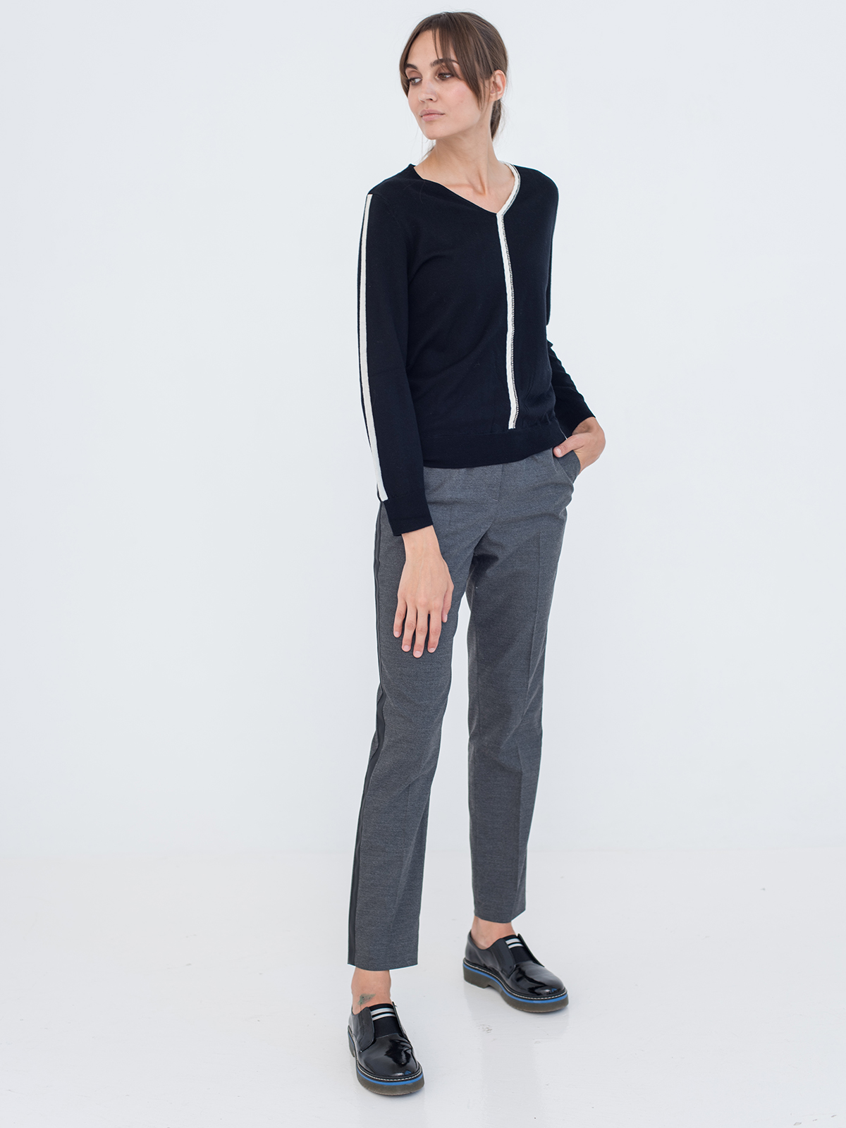 Прямые однотонные брюки с лампасами – оригинальный дизайн, выдержанный в деловом стиле. Комфортная средняя посадка, эластичный пояс с кулиской гарантируют удобство ношения. Приятный к телу материал. Трендовая длина 7/8. Брюки хорошо сочетаются с рубашкой, джемпером или блейзером.