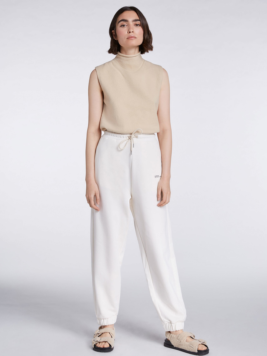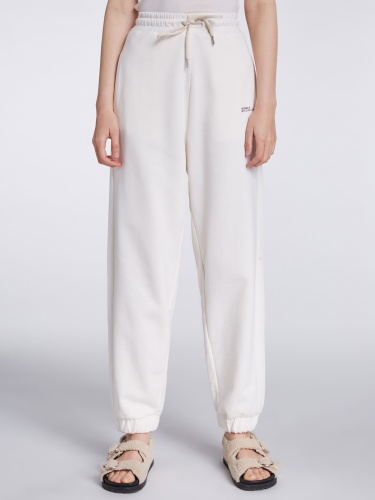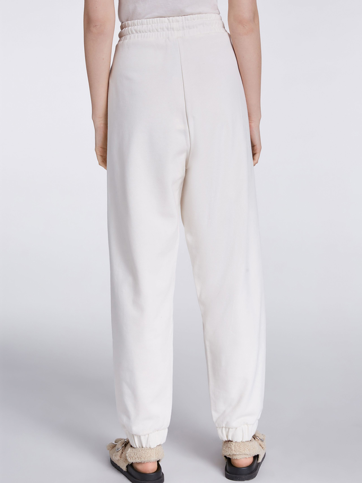 Брюки в спортивном стиле из смесового хлопка. Эластичный пояс с кулиской обеспечивают идеальную посадку по фигуре. Акцент в виде маленькой надписи на левой штанине. Длина 42 размера: 102 см. Рост модели 179 см, ее размер – 42 (российский).
