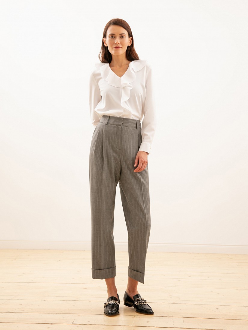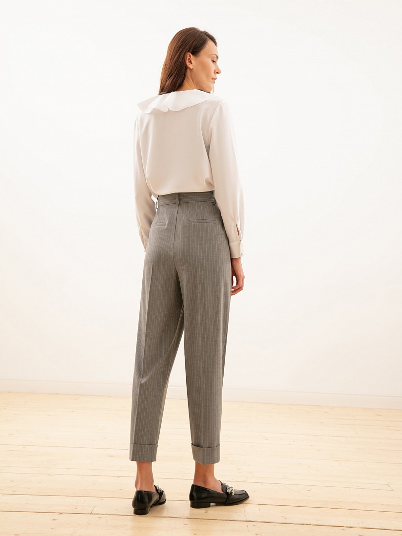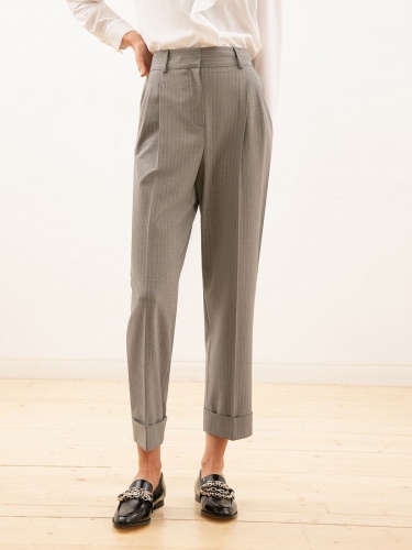 Укороченные брюки в полоску с подворотами для образа в деловом стиле. Высокая посадка, притачной пояс со шлевками, застежка на скрытую молнию и крючок. Стрелки визуально вытягивают рост. Брюки можно носить самостоятельно или в комплекте с жакетом из той же коллекции.