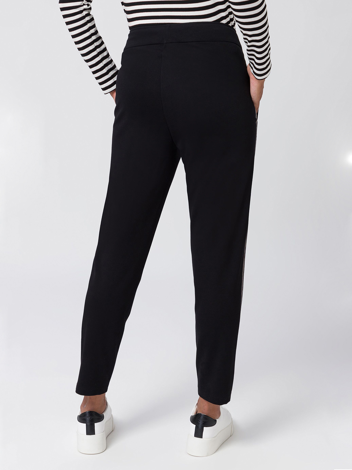 Однотонные брюки в спортивном стиле. Прямой силуэт, укороченная длина. Комфортная средняя посадка. Лампасы в цвете металлик сбоку брючин.
