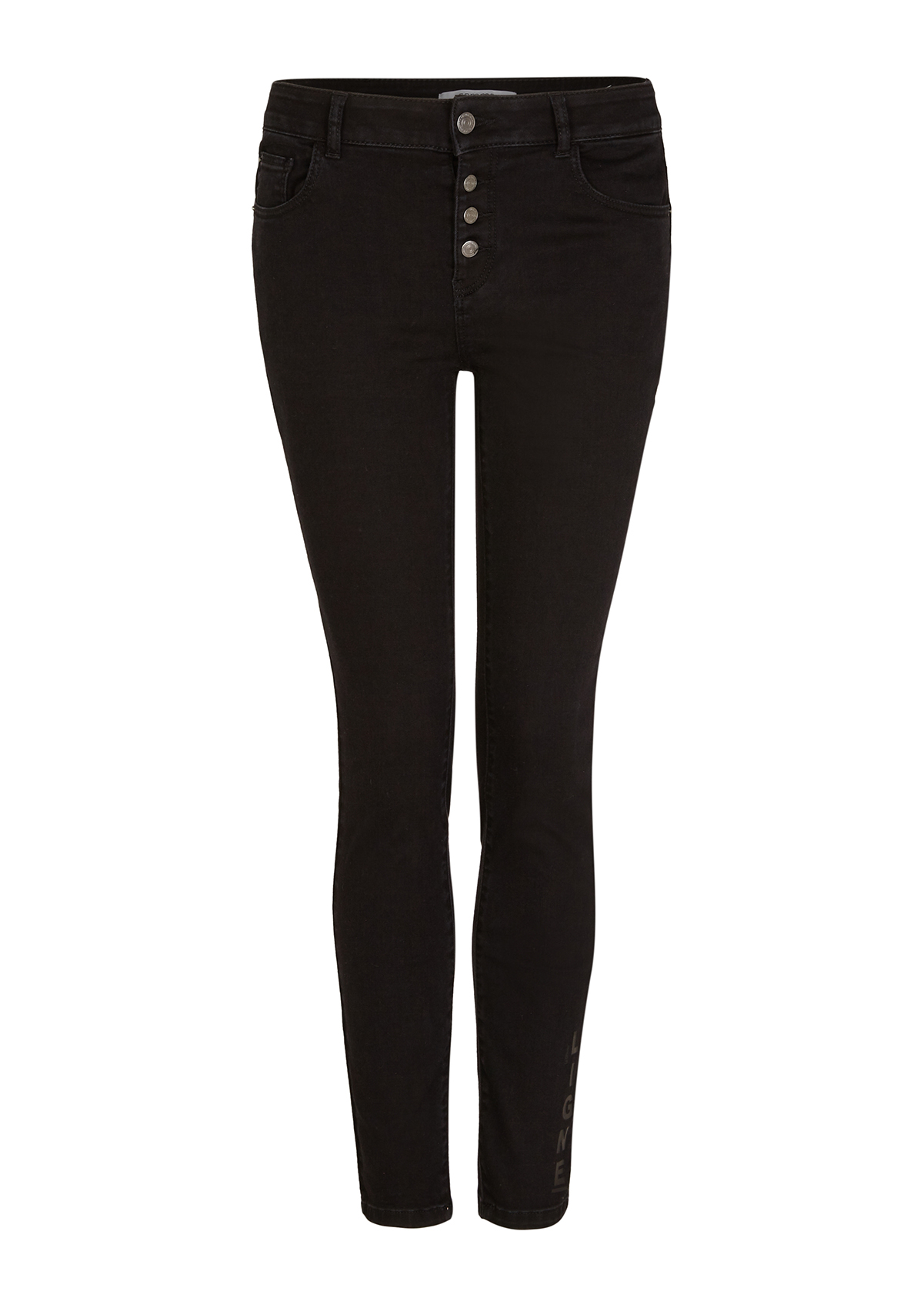 Зауженные джинсы с потертостями и принтом. Высокая посадка, пояс со шлевками. Внутренние передние и задние накладные карманы. Застежка на скрытую молнию и пуговицу.