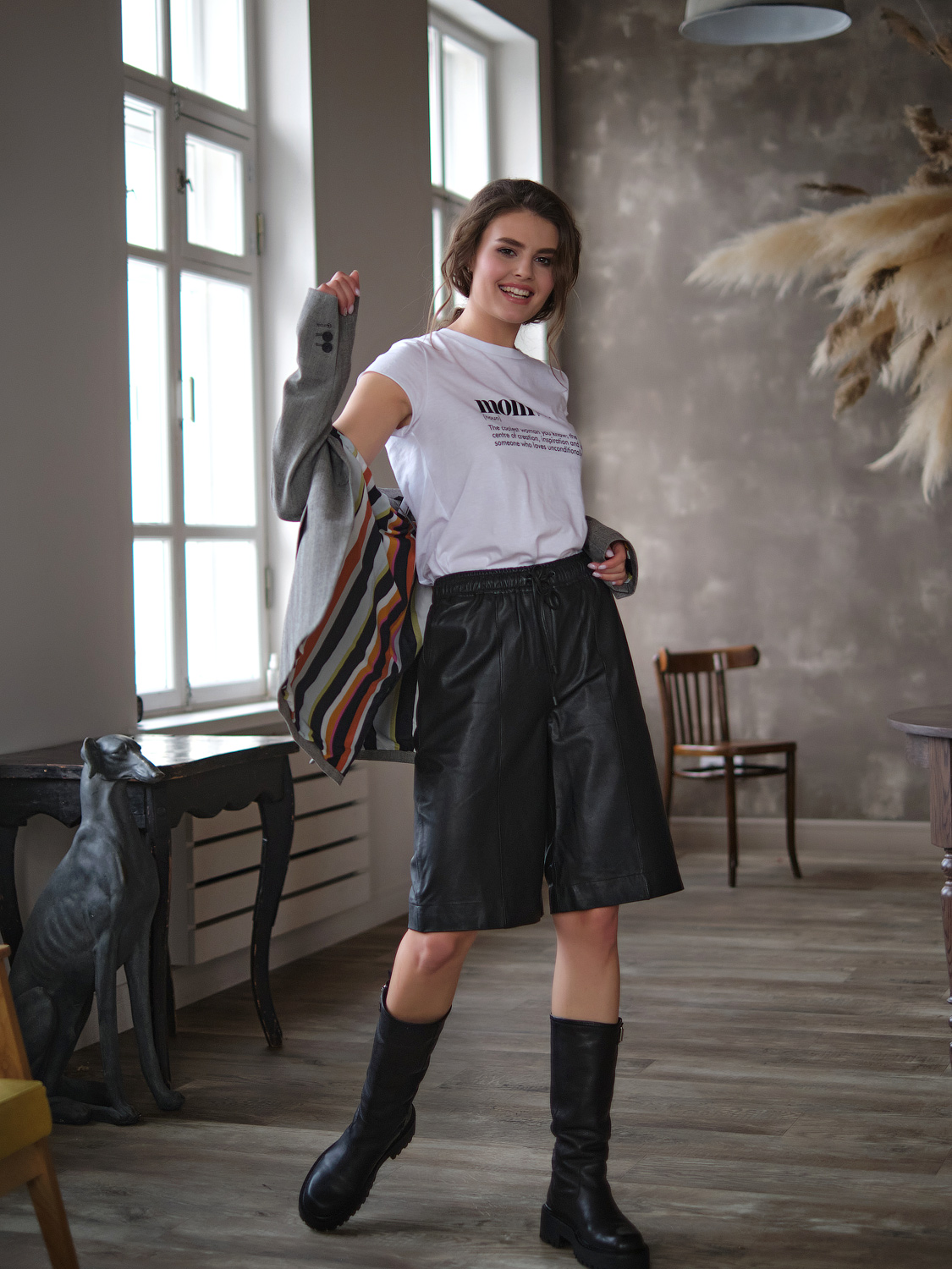 Экстравагантные кожаные шорты могут стать яркой акцентной деталью в совокупности со сдержанным верхом. Смелый и невероятно стильный атрибут гардероба по-настоящему стильной женщины. Свободный силуэт, длина до колена, эластичный пояс на кулиске.