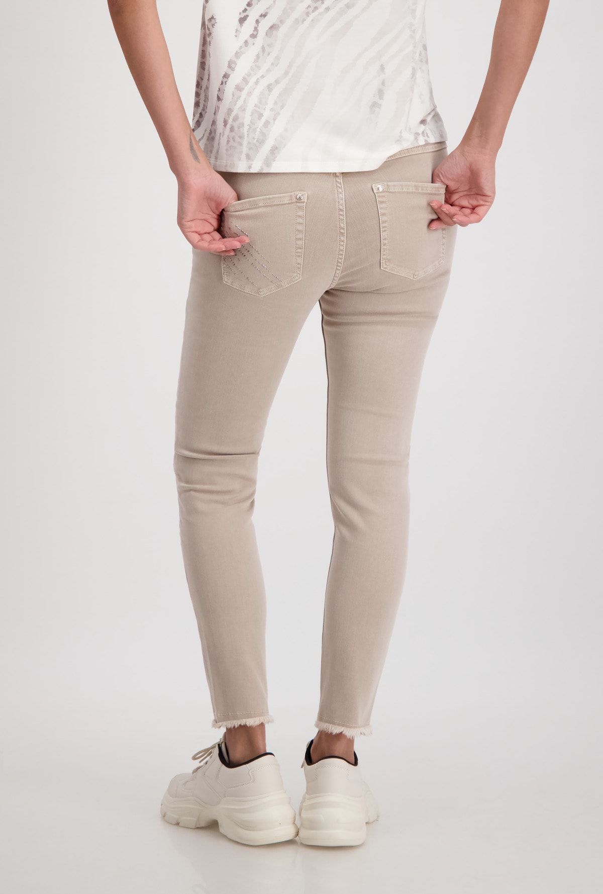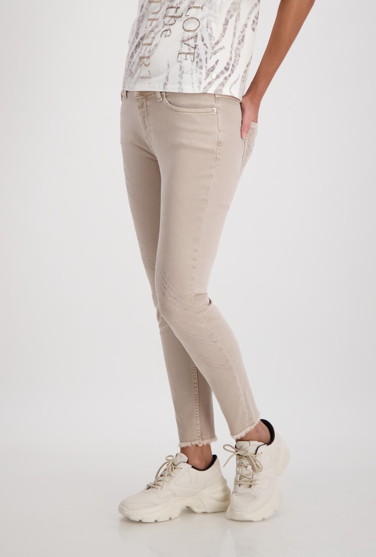 На сайте указаны российские размеры. Узкие джинсы с пятью карманами и эффектными стразами. Узкий крой с петлями для ремня на поясе, классическая посадка и пять карманов. Низ штанин украшен стильной бахромой, а сверкающие полоски со стразами эффектно украшают модель. Параметры модели: 42 размер, рост 179 см