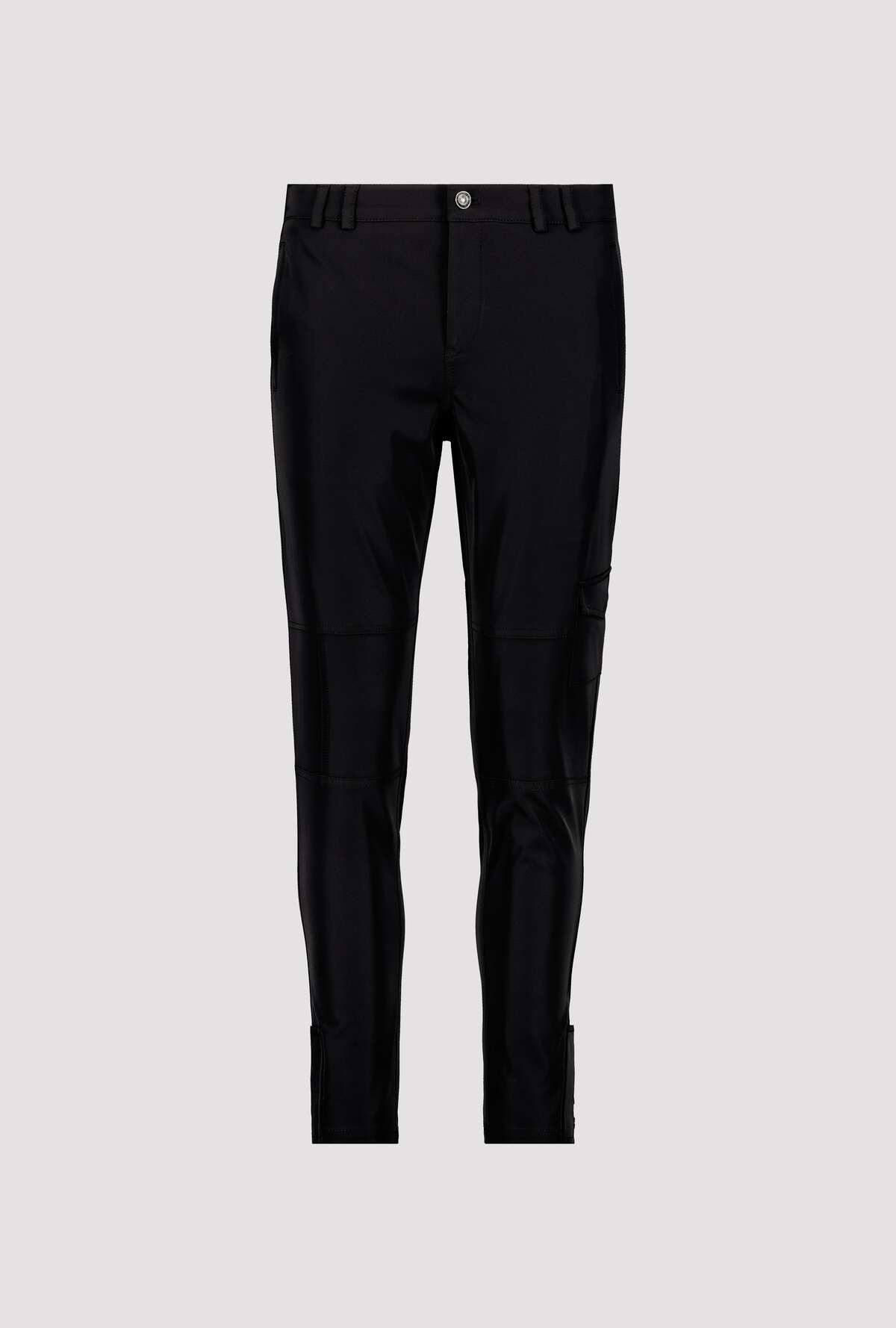 На сайте указаны российские размеры. Черные брюки с подворотами зауженного кроя. Чрезвычайно эластичное и простое в уходе качество. Благодаря высокому содержанию эластана в штанах так же легко двигаться, как и в спортивных штанах. Прямой пояс с петлями для ремня, пуговицей и потайной молнией. Передняя часть имеет боковые прорезные карманы со потайной молнией, горизонтальные и вертикальные разделительные швы и накладной карман с клапаном на уровне колена. Разрез со вставкой и декоративная планка на кнопках украшают штанины. Рост модели 179 см