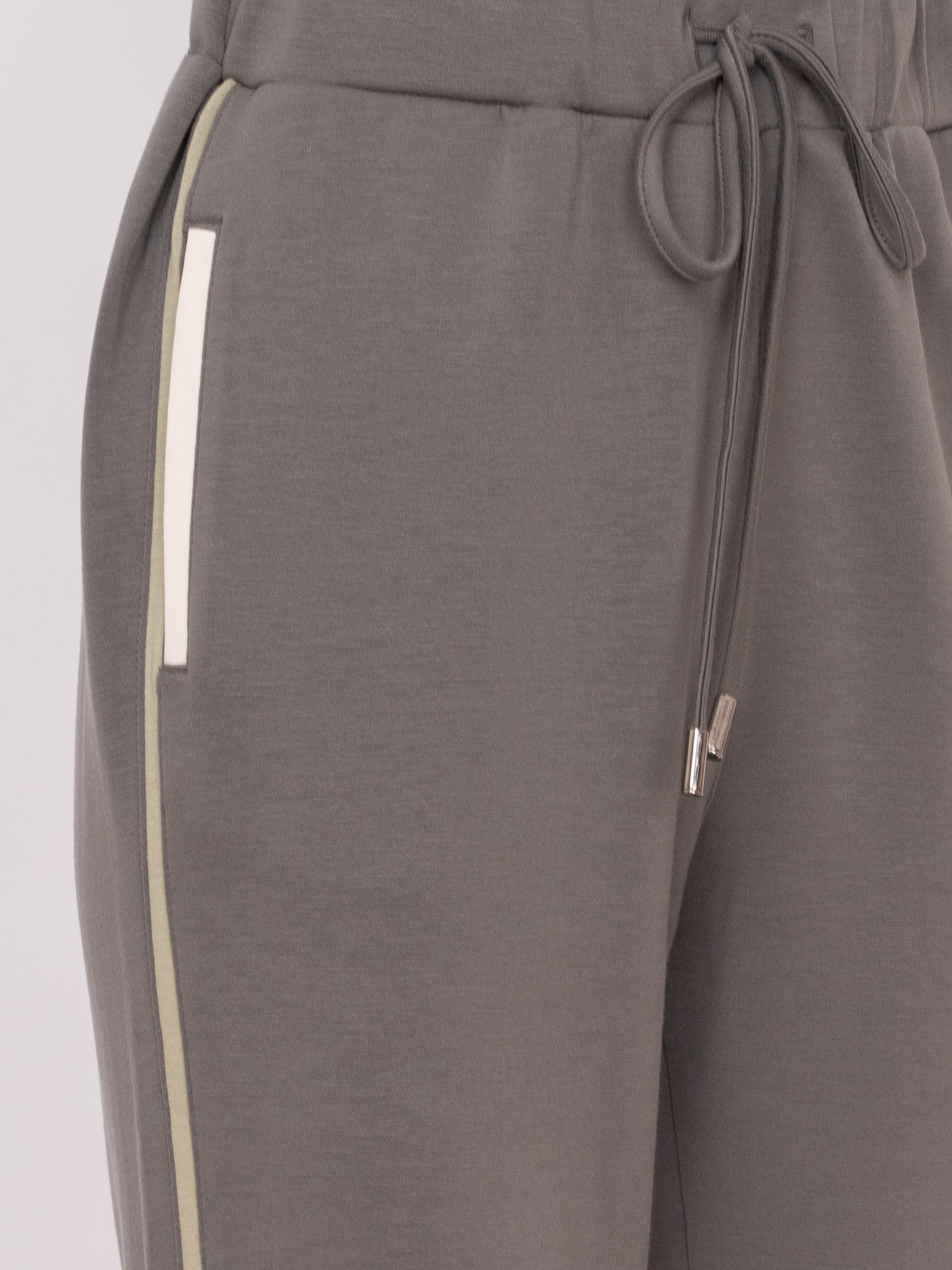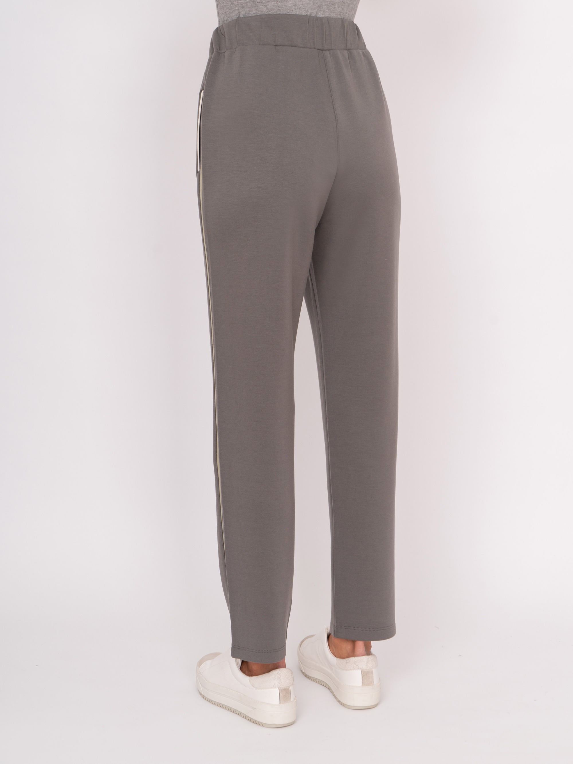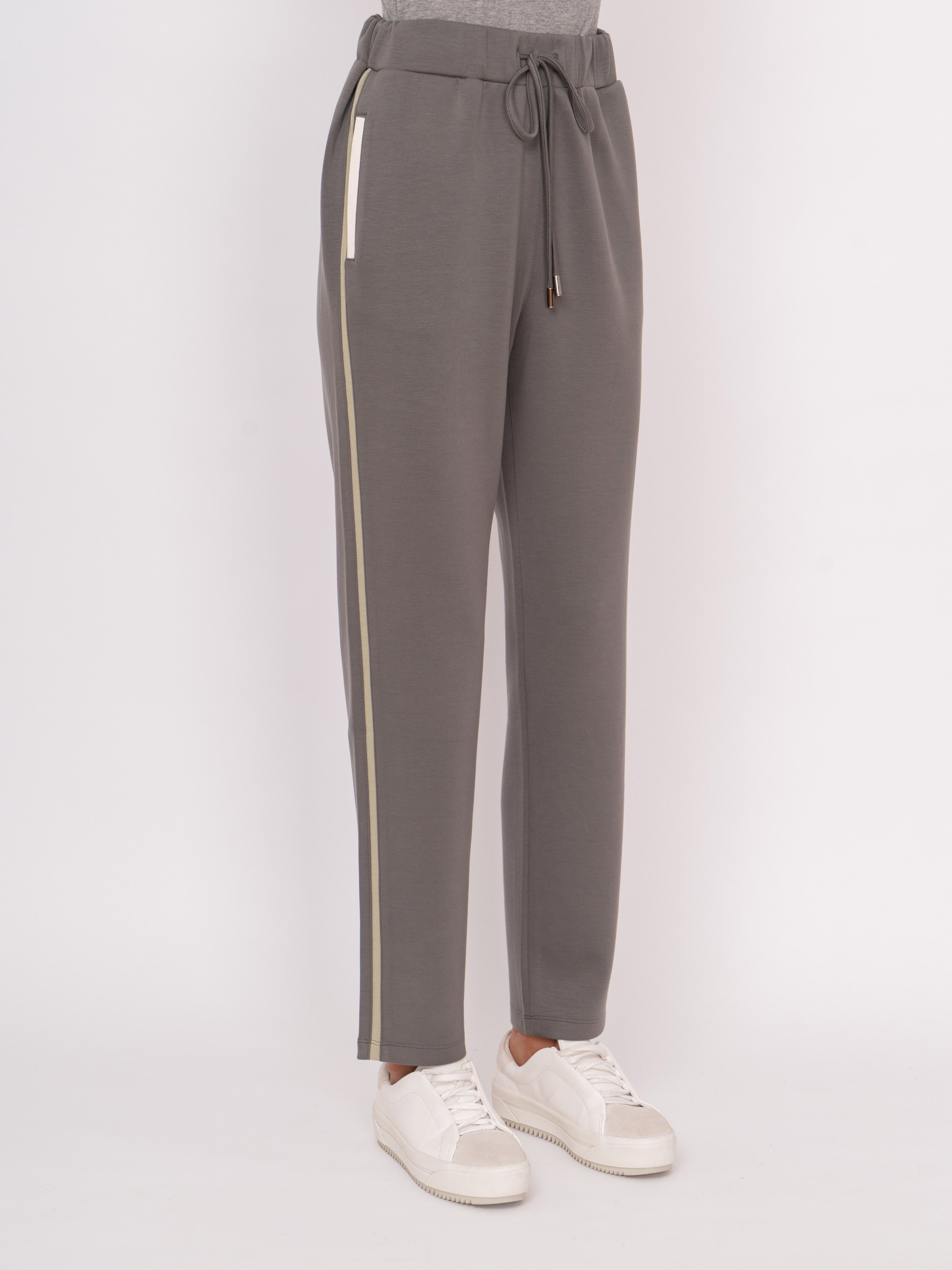На сайте указаны российские размеры. Зауженные трикотажные спортивные брюки на резинке с завязками, с прорезными карманами, с белыми и зелеными полосками. Рост модели: 175 см Длина брюк: 71 см