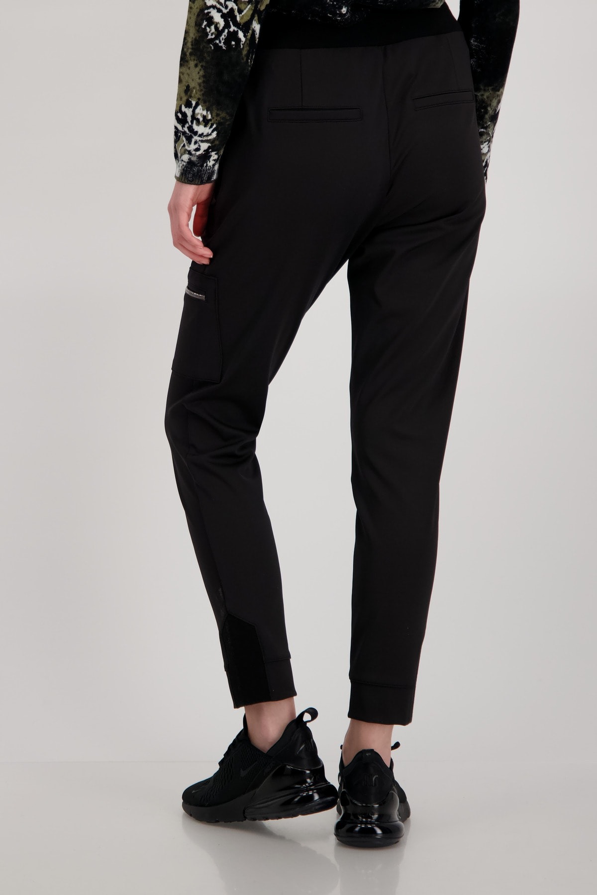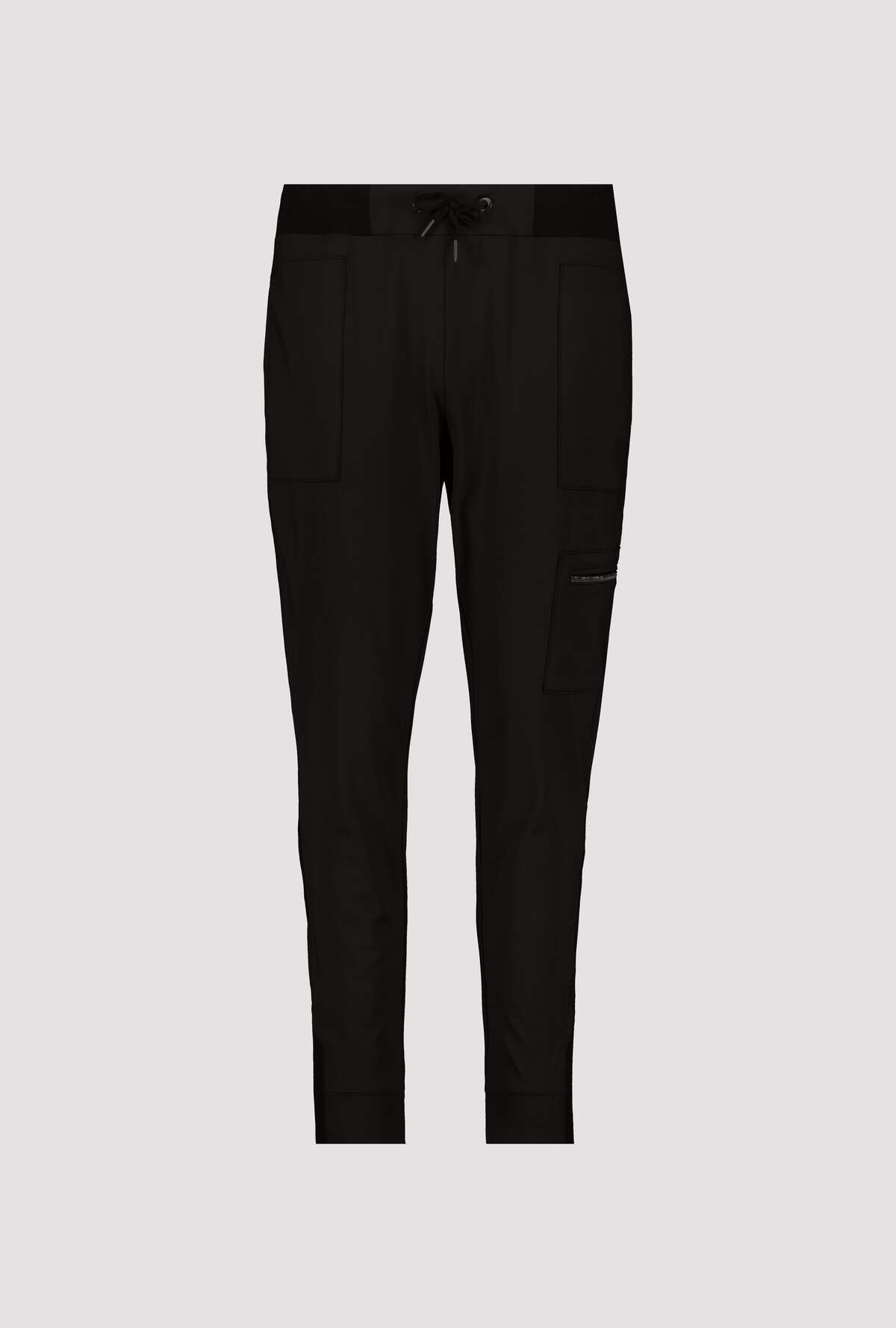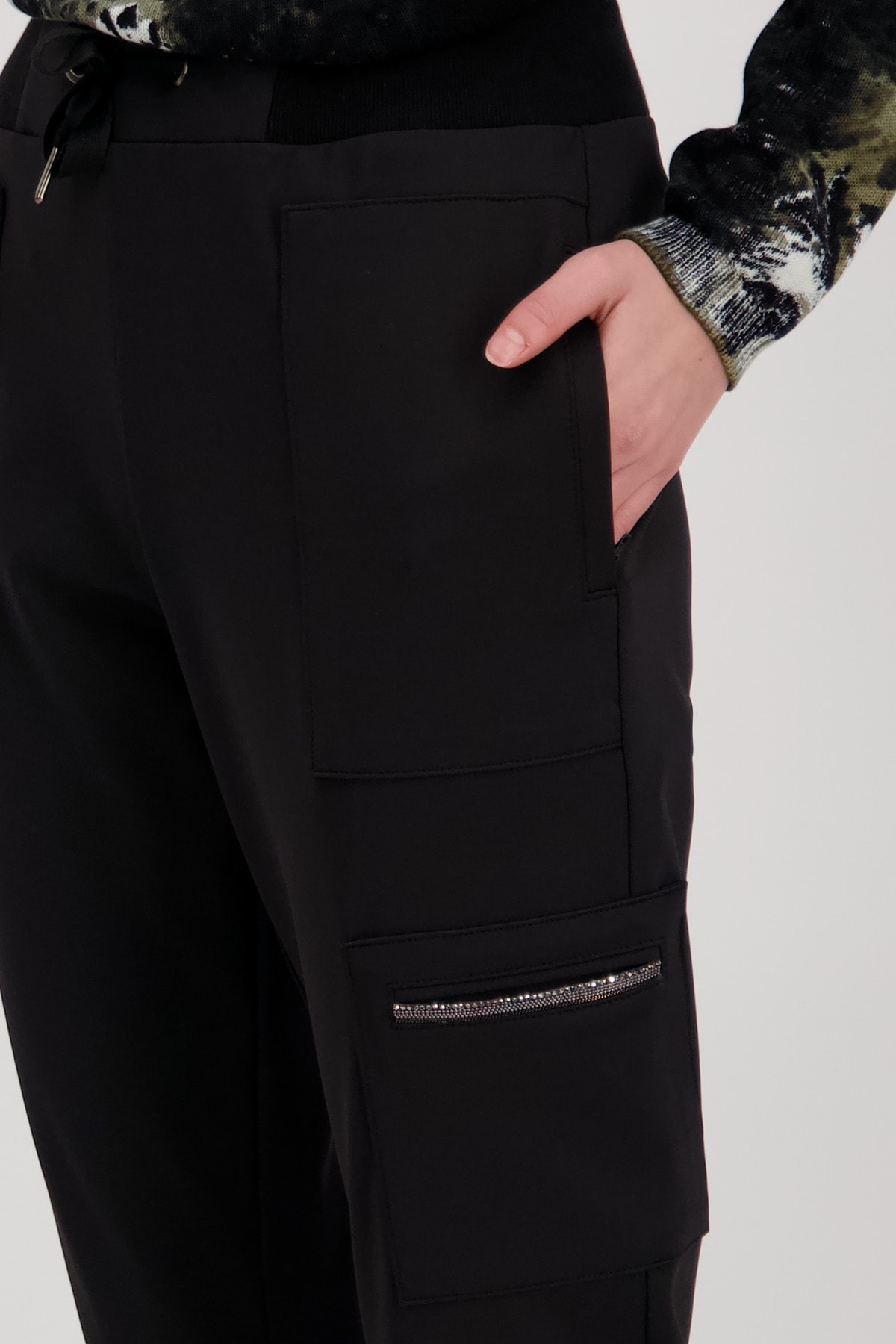 На сайте указаны российские размеры. Эластичные джоггеры-карго от monari, струящегося качественного полиамида эластичного, свободного кроя узкого кроя с нормальной посадкой, поясом с завязкой, пуговицей и потайной застежкой-молнией, а также штанинами с манжетами. Крепится к колену сбоку: классическая сумка-карго на молнии. Прорезные карманы на молнии спереди и ложные прорезные карманы сзади завершают дизайн брюк черного цвета. Рост модели: Рост модели 178 см. Длина по внутреннему шву: 72 см.
