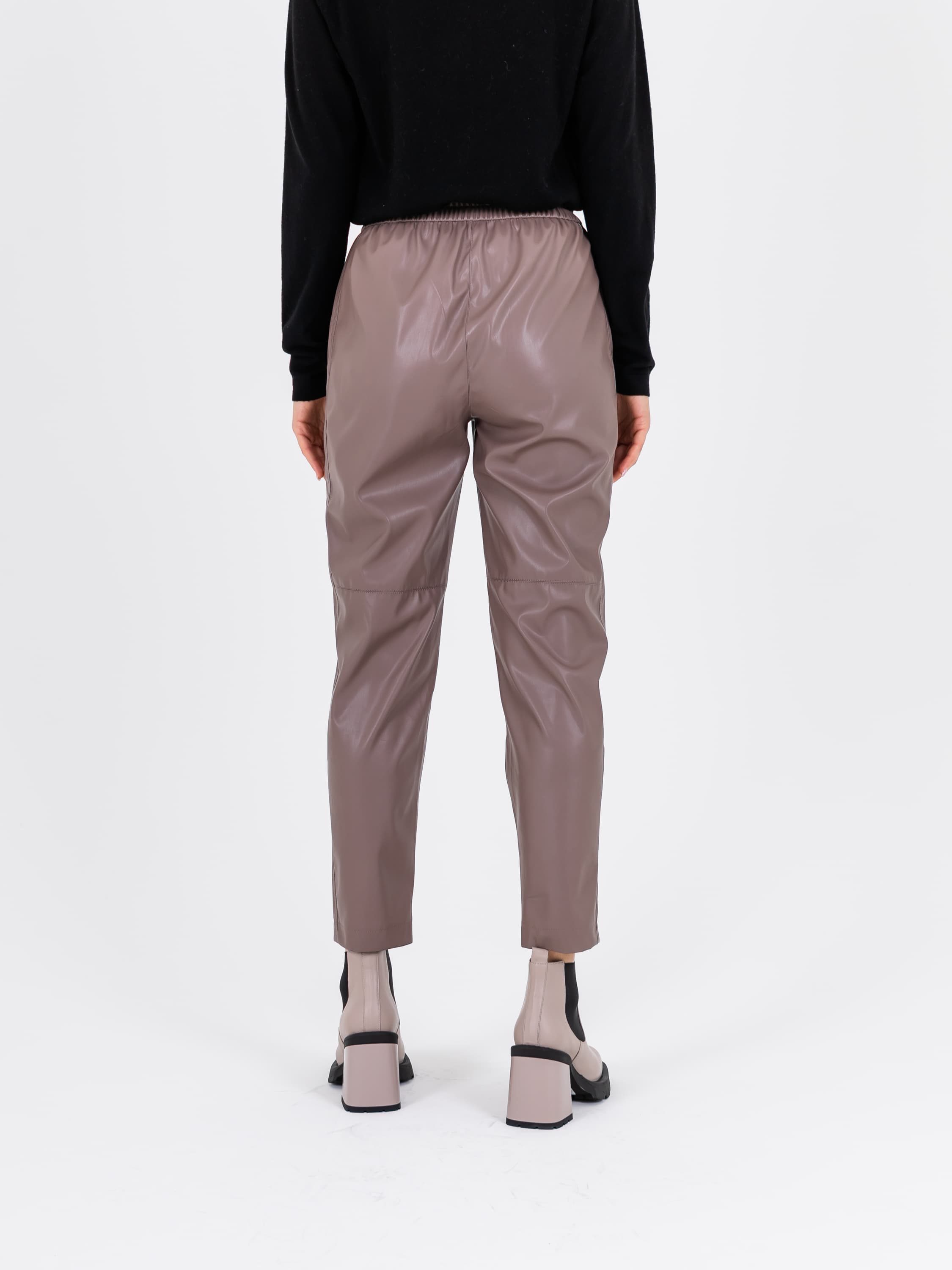 На сайте указаны российские размеры. Брюки из экокожи слегка укороченные в бежевом цвете. Впереди застежка на молнию и пуговицу, сзади эластичная резинка. Модель имеет 2 кармана спереди. Ткань: искусственная кожа высокого качества (55% полиуретан, 40% поливискоза, 5% эластан). Практичный материал, загрязнения с которого легко удаляются влажной салфеткой, что особенно актуально в межсезонье. Крой: прямой свободный силуэт создает идеальную вертикаль, которая визуально вытягивает и стройнит фигуру, корректируя область бедер. Имеют актуальную высокую посадку. Удобные карманы по бокам вместят все самое важное, что может пригодиться в ближайшее время. Застегиваются на пуговицу и молнию. Стильный оттенок тауп подчеркнет прекрасный вкус и чувство стиля. Отделка: верхняя и нижняя часть брюк разделяются неконтрастной строчкой, которая добавляет оригинальности, но не перегружает образ. Рост модели 175 см.