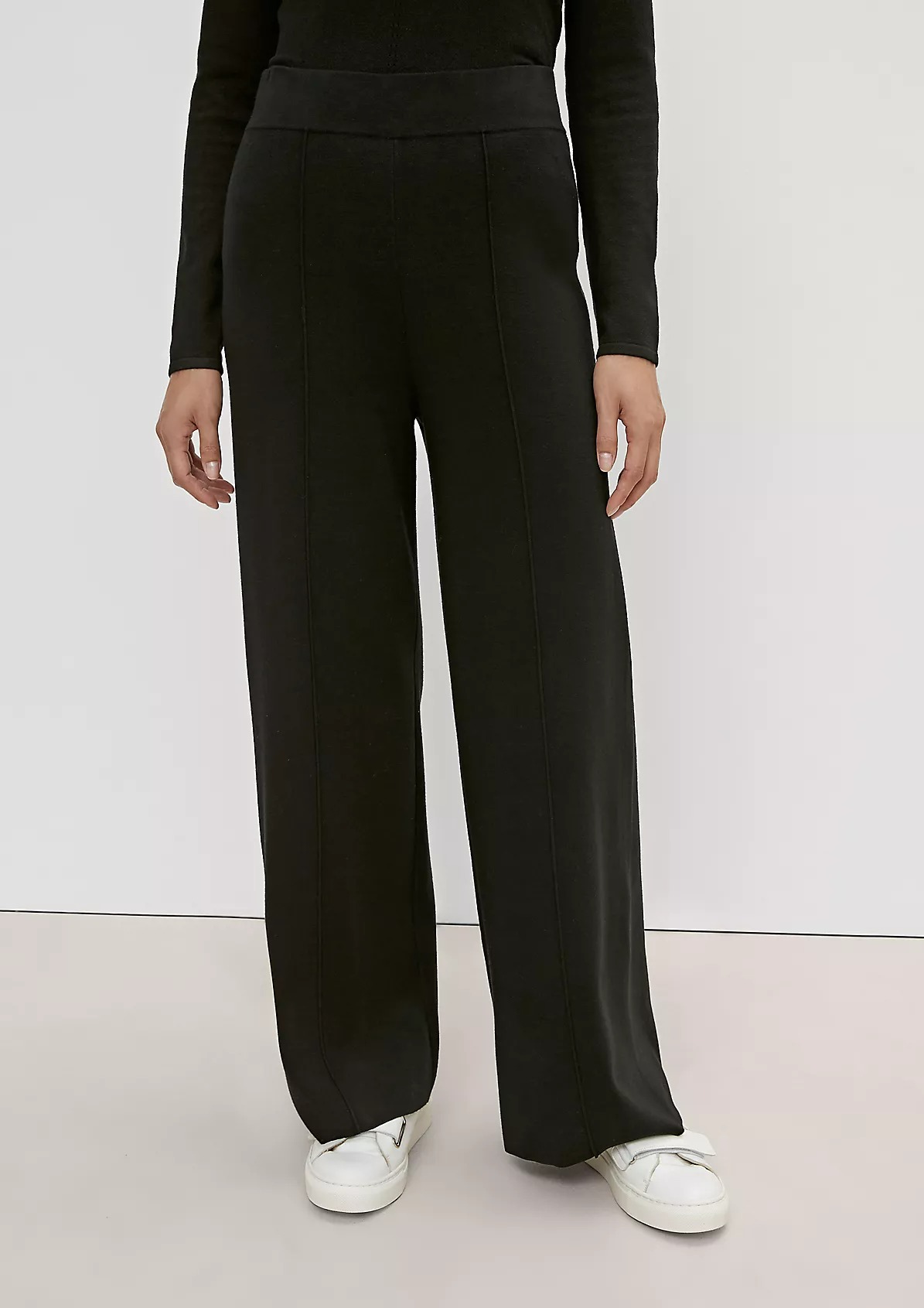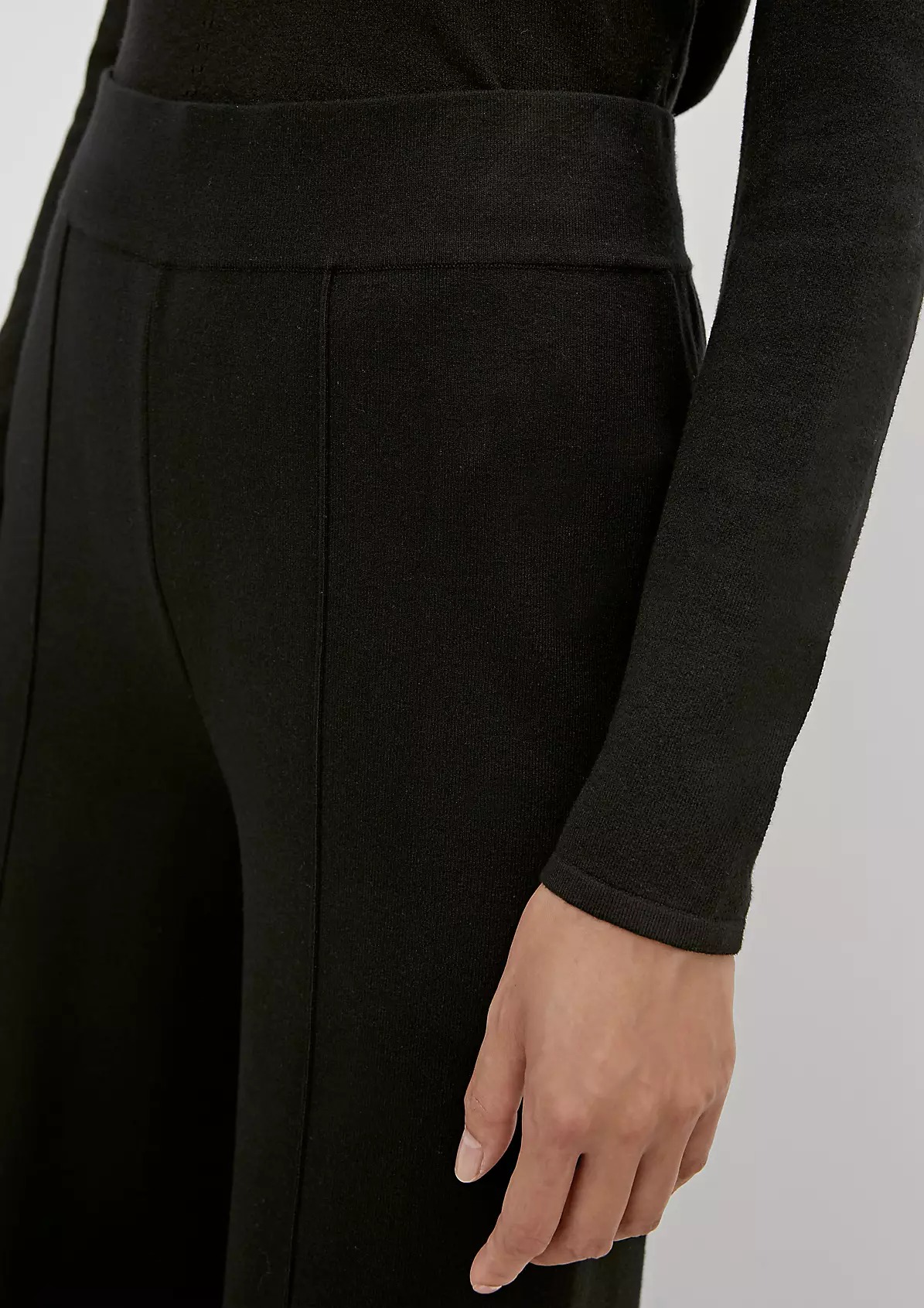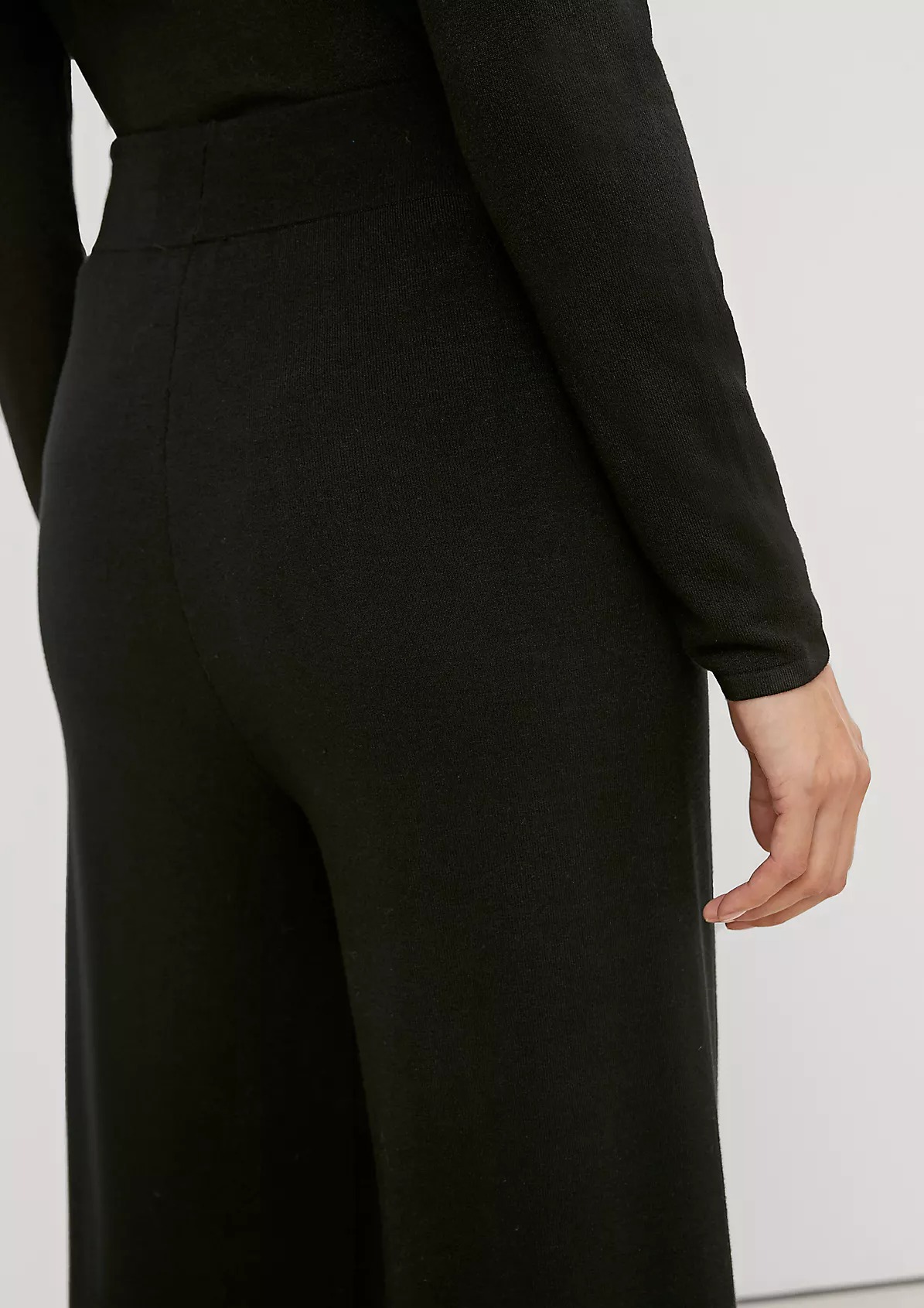 На сайте указаны российские размеры. Брюки-кюлоты из тонкого трикотажа прямой формы. Пояс на резинке. Внутренняя длина штанины составляет около 76 см для размера 42. Рост модели 175 см.
