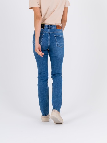 Длинные джинсы «Slim Fit» с застежкой на молнию и 1 пуговицу. Джинсы слегка зауженные книзу, с легким варёным эффектом. На передних половинках расположены два кармана с отрезным бочком и один монетный карман. На задних половинках два накладных кармана с декоративными горизонтальными швами и фигурная кокетка. Верх брюк обработан поясом со шлевками.