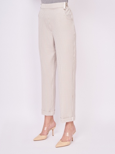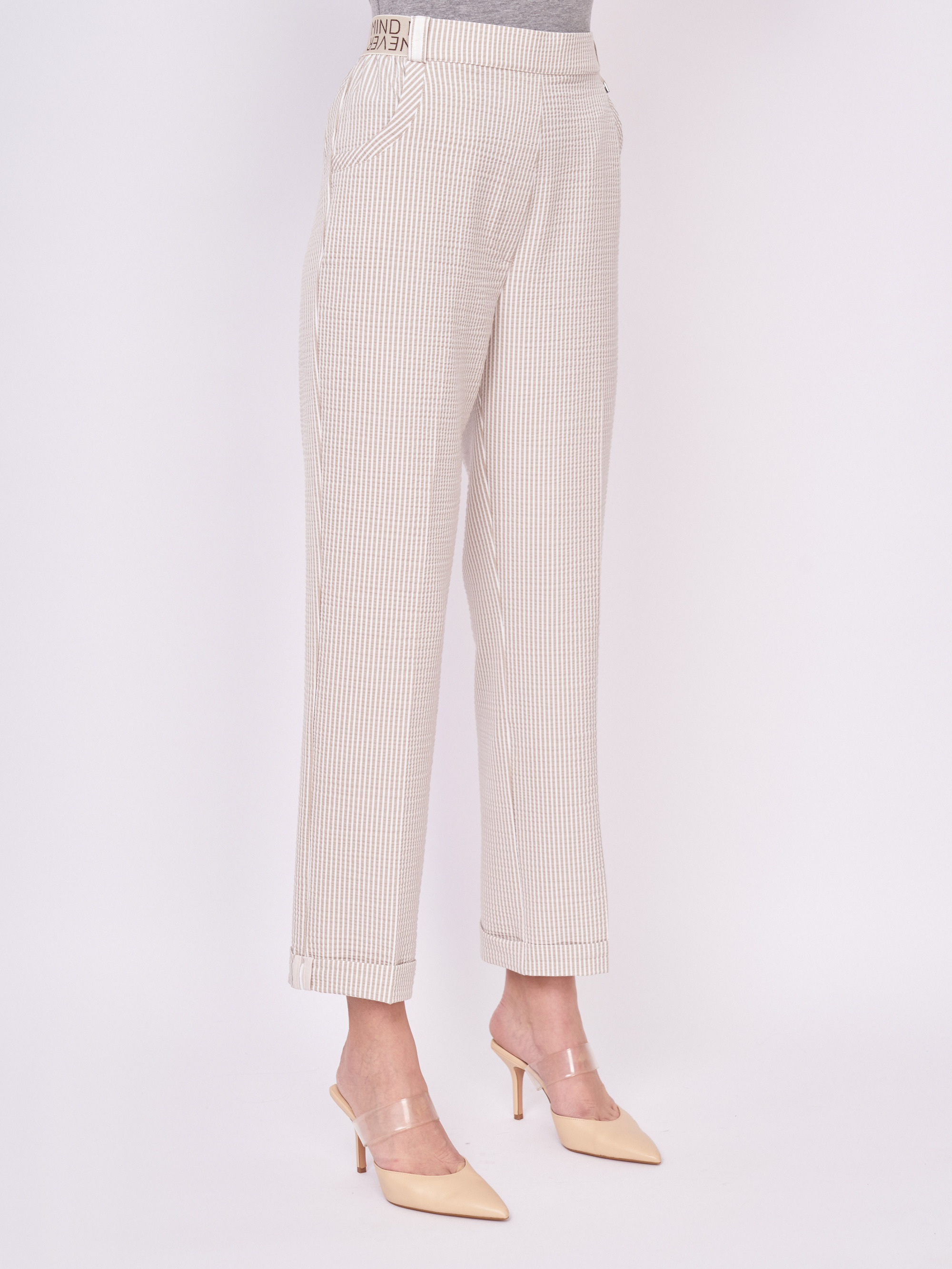 На сайте указаны российские размеры. Текстильные зауженные брюки в бело-бежевую полоску на резинке, с косыми карманами, с подворотами. Длина брючин: 71 см. Рост модели: 177 см.