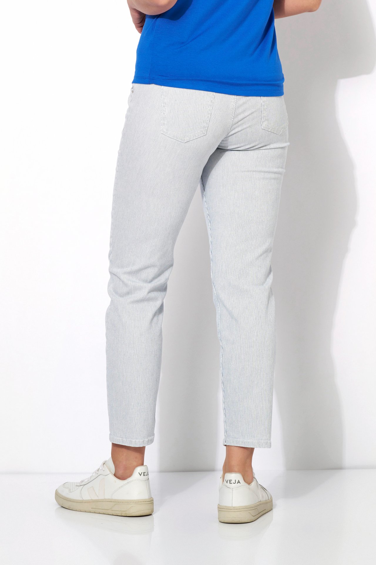 На сайте указаны российские размеры. Свободные джинсы средней посадки с тонкой полоской, средней талией и продуманным решением карманов. Длина по внутреннему шву: 74 см. Рост модели 178 см.