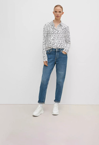 На сайте указаны российские размеры. Джинсы свободного кроя с эффектом потертости. Застежка на кнопки. Длина штанины по внутренней стороне для размера 42 около 74 см. Рост модели 178 см.