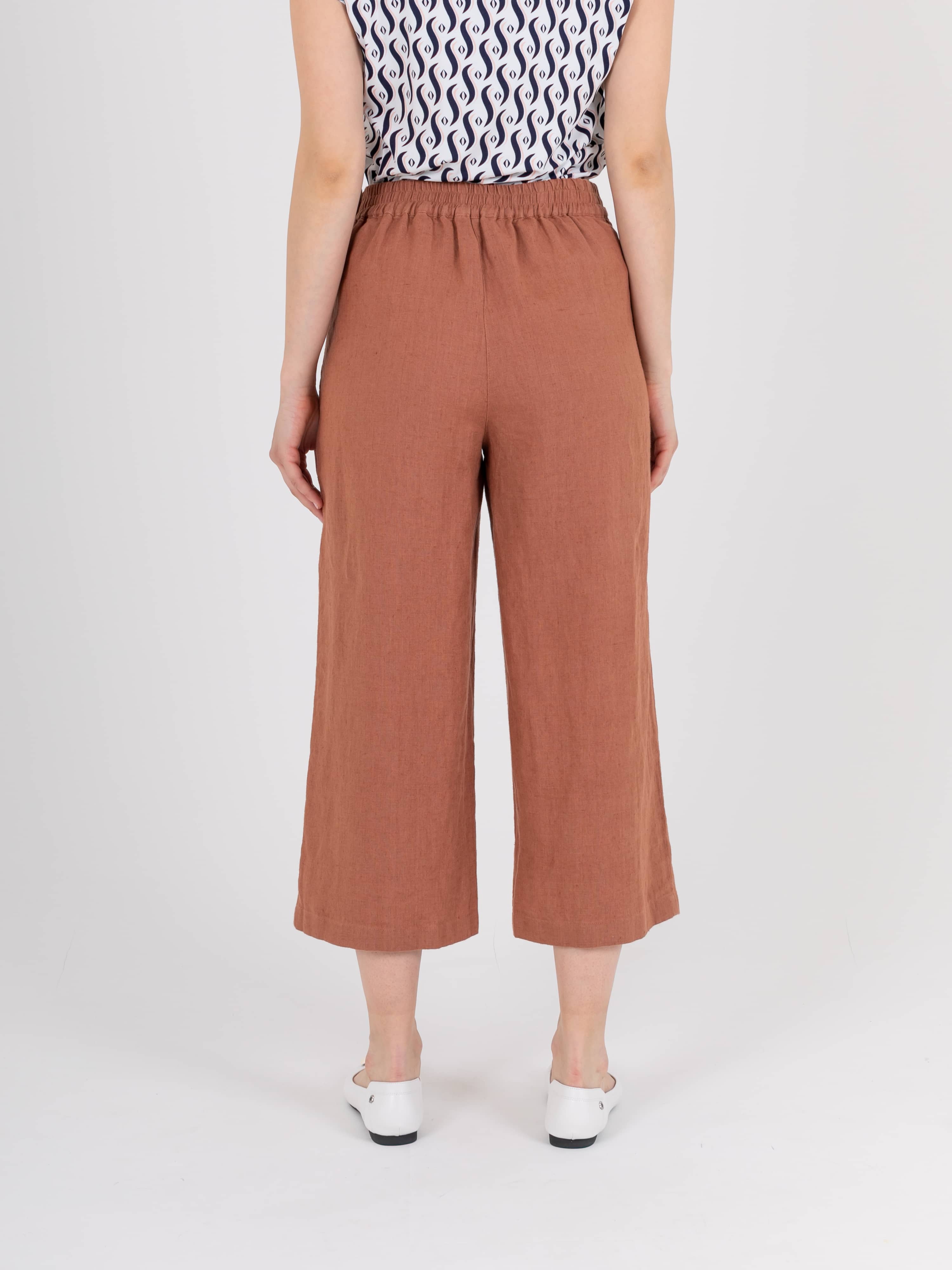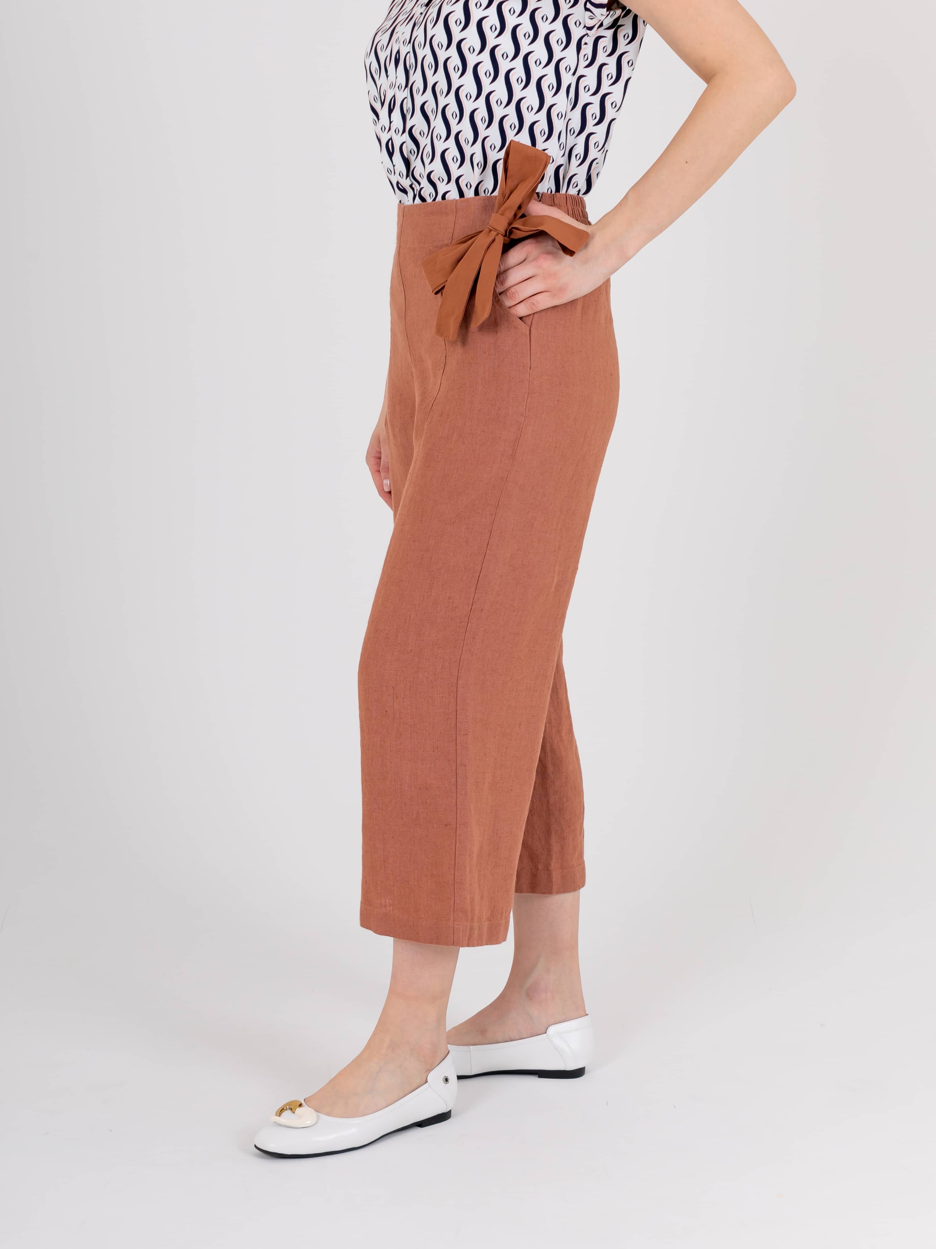 Укороченный прямые брюки, длиной до щиколоток «трубы» с застежкой на молнию в боковом шве из натурального льна. На передних половинках расположены два кармана с отрезным бочком. Верх брюк обработан поясом на резинке и со шлевками, также есть съемный пояс.