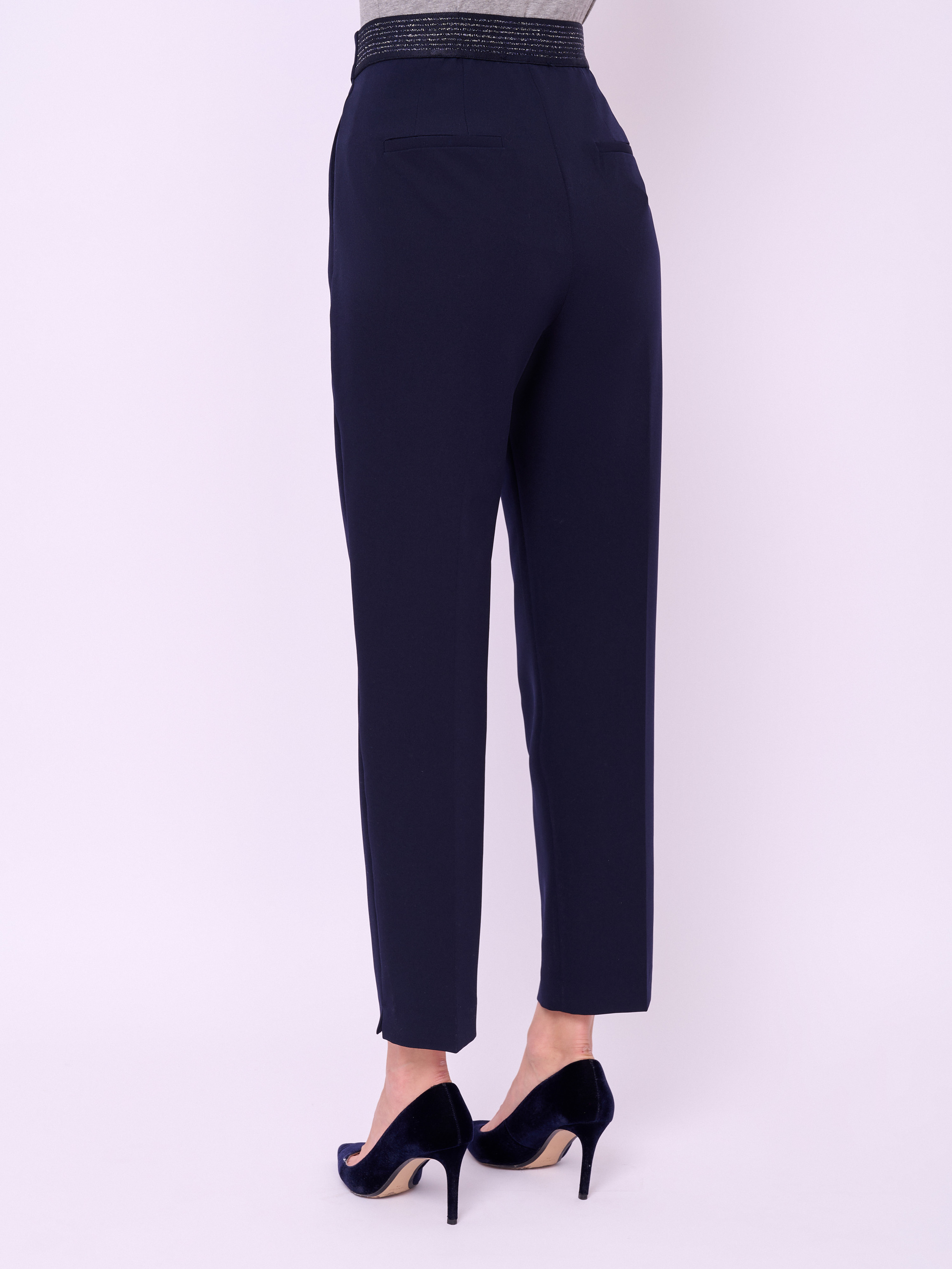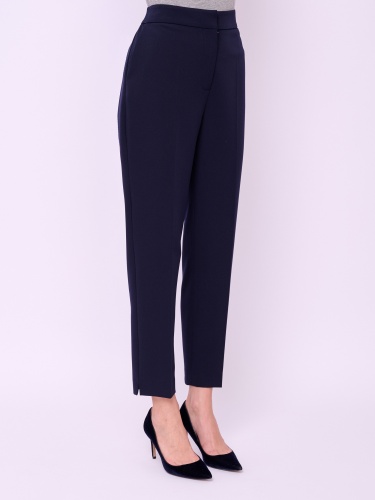 Брюки классические зауженного покроя из текстиля на молнии и резинке с косыми карманами, стрелками и небольшими боковыми разрезами по низу брючин. Длина брючин: 70 см.