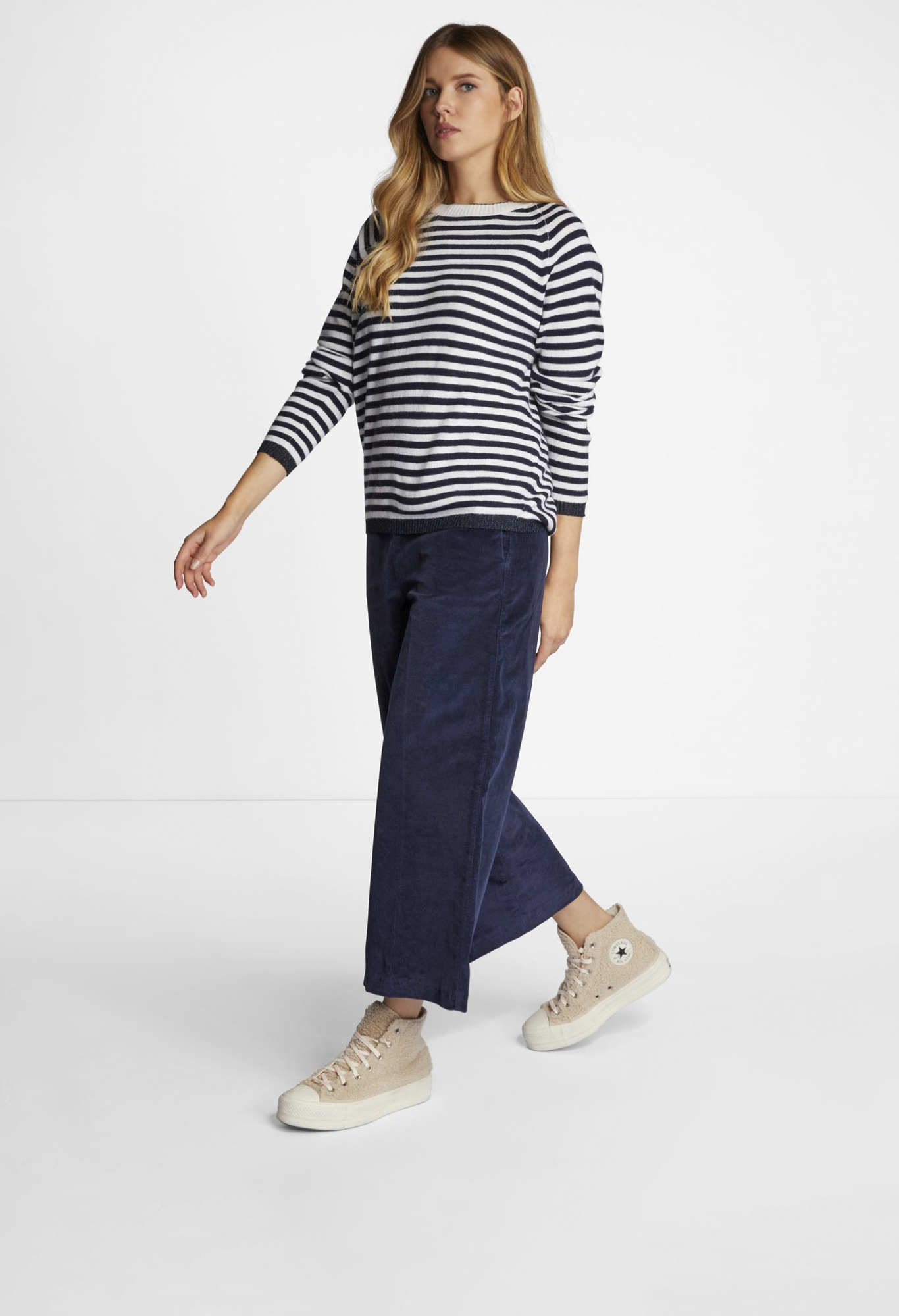 Вельветовые брюки-кюлоты изготовлены из смеси мягкого материала с добавлением хлопка и стрейча. Эластичный пояс подчеркивает комфорт при ношении. Длина для размера 42: 60 см.