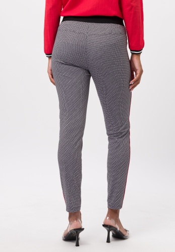 Брюки женские с контрастными полосками по бокам. Сочетание приятной эластичности, модного рисунка по всей поверхности, контрастных боковых полос, ламинированных карманов на молнии и контрастного эластичного пояса не оставит равнодушным ни одно модное сердце. Брюки этого классного дизайна незаменимы и станут изюминкой любого образа.