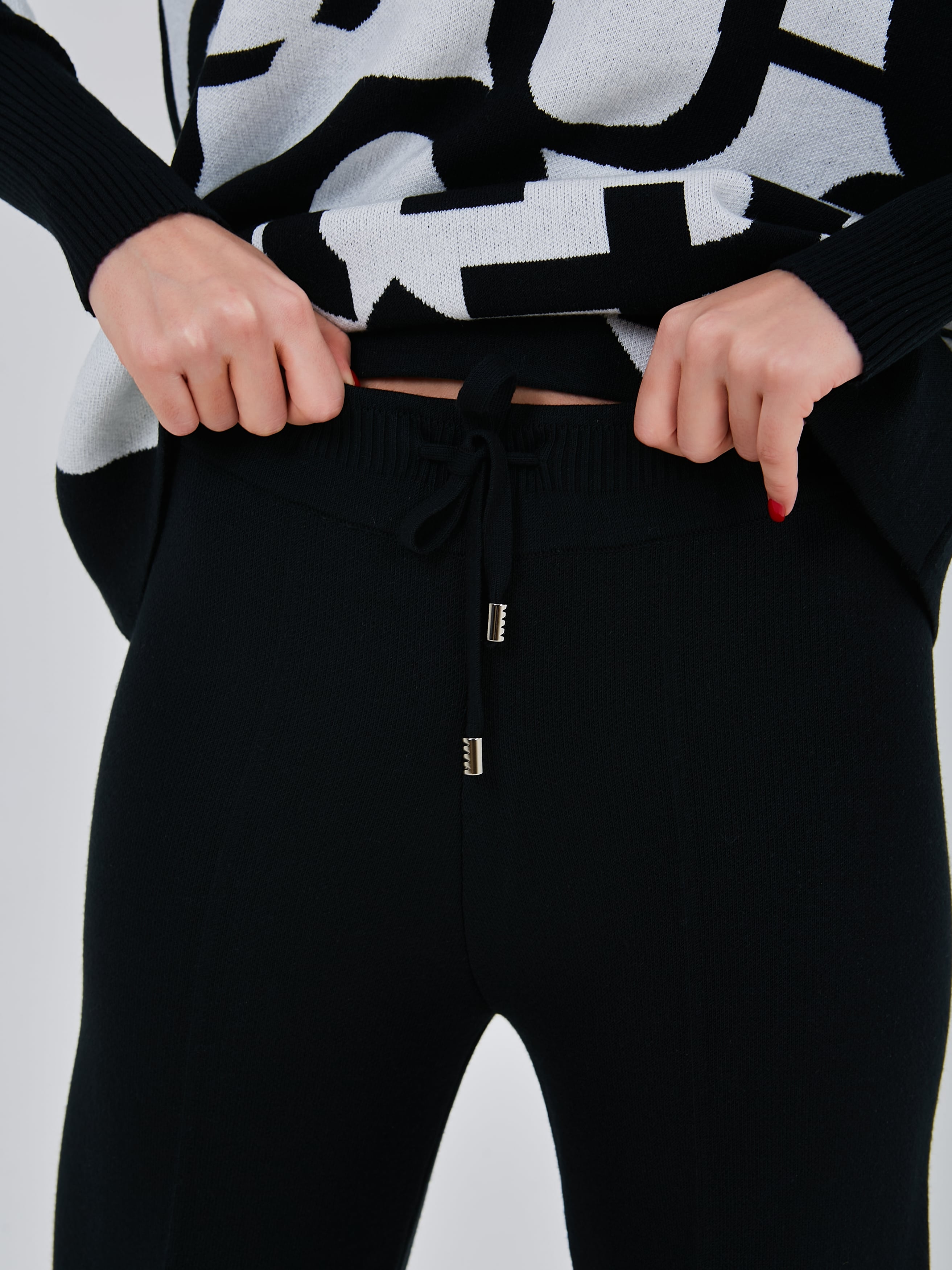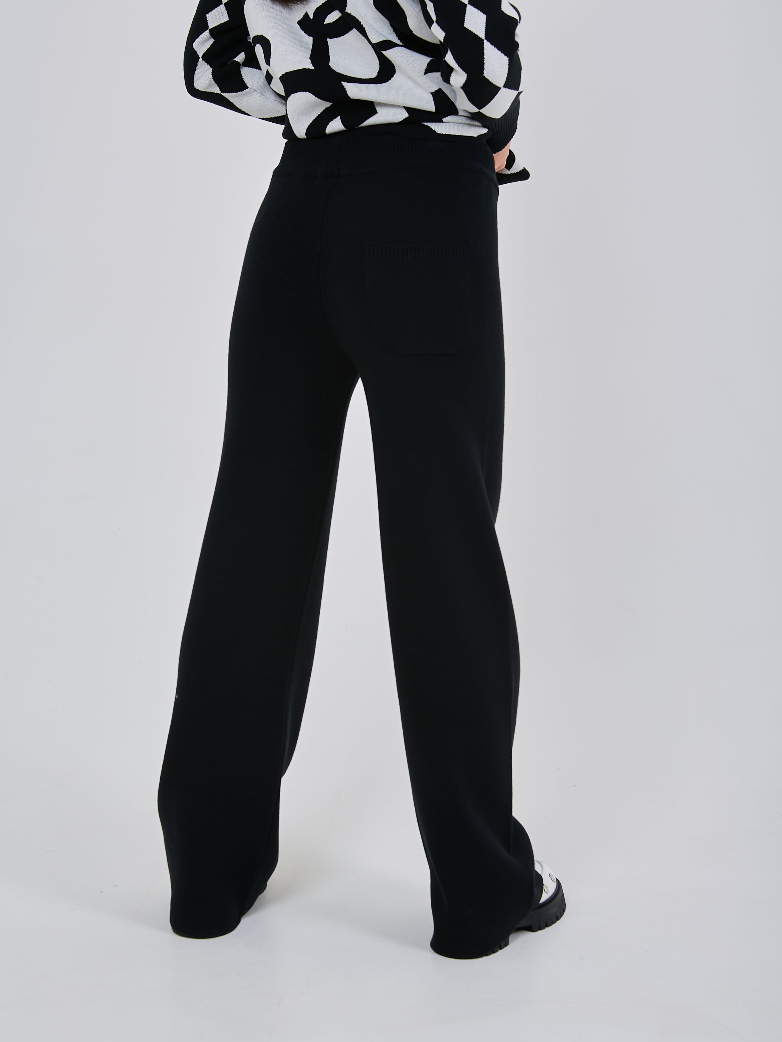 Трикотажные брюки с комфортным поясом на шнурках, дополнены небольшой стрелкой, зрительно вытягивающей силуэт. Осень-Зима'25/26. Капсула "Малахитовая шкатулка"
