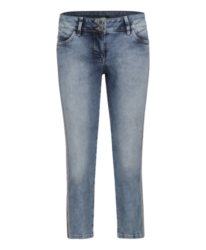 Укороченные потертые джинсы обращают на себя внимание. Универсальная средняя посадка, прямой крой. Длина брюк позволяет подчеркнуть модную обувь. Отделка тесьмой вдоль боковых швов. Материал из хлопковой смеси приятен к телу и обеспечивает комфорт. Эти джинсы - отличный вариант низа для множества образов в стиле кэжуал.