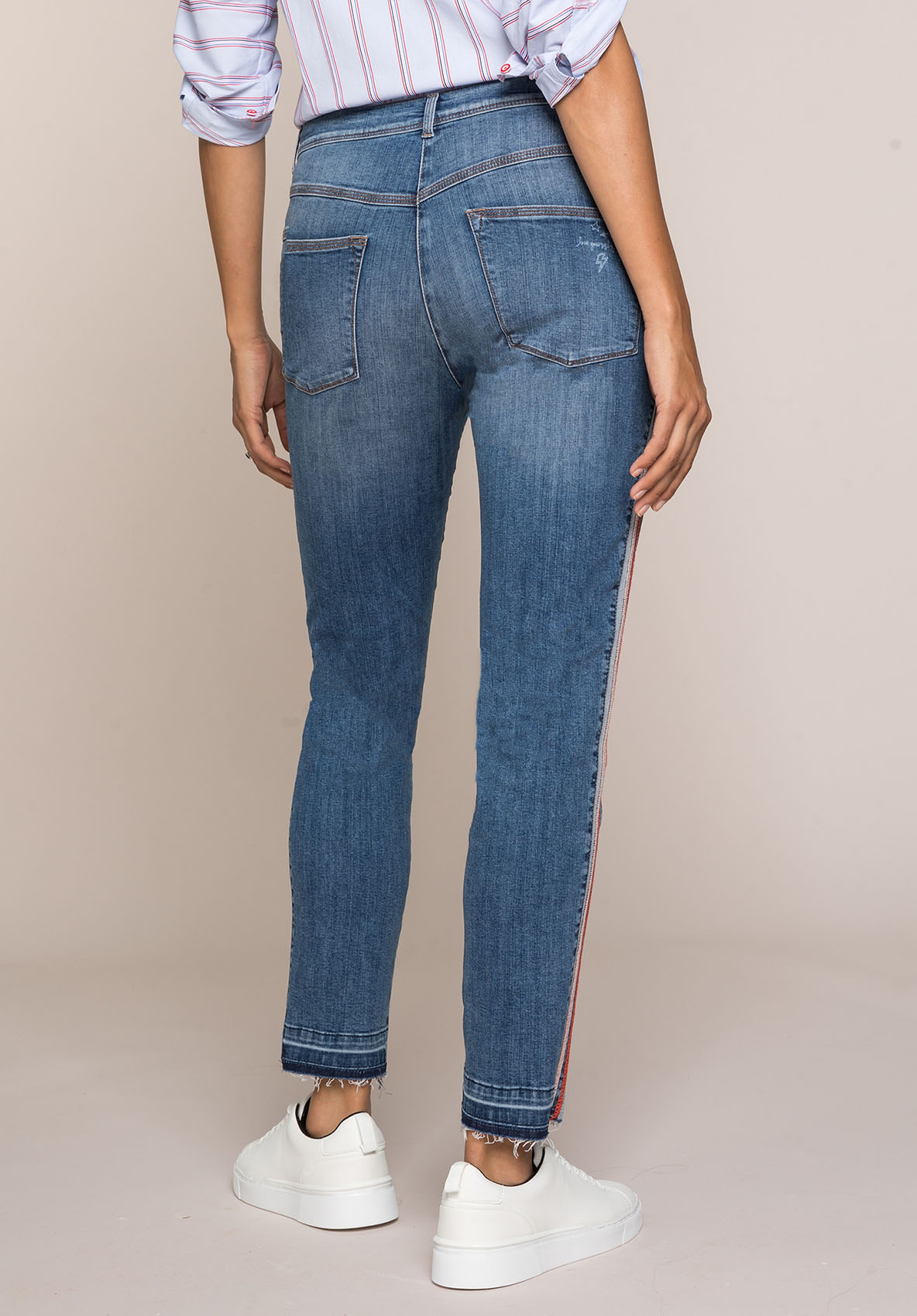 Джинсы Shape благодаря прилегающему силуэту подчеркивают линию ног. Модные потертости, полосы по бокам в спортивном стиле и открытый нижний срез с бахромой придают брюкам демократичный вид. Неважно, спортивный или шикарный образ вы создаете, эти джинсы станут вашей модной изюминкой сезона. • джинсы с эффектом потертости и бахромой по низу • эластичная хлопковая джинсовая ткань • 5 карманов • яркие полосы по бокам • силуэт slim, средняя посадка • длина около 74 см