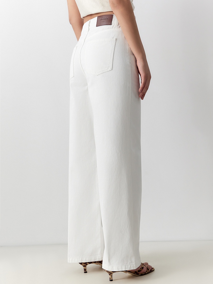 Широкие прямые джинсы из 100% молочного хлопка с твиловым переплетением для лучшей формоустойчивости. Полная длина позволяет носить их с обувью на каблуке. Застежка молния и болт.
