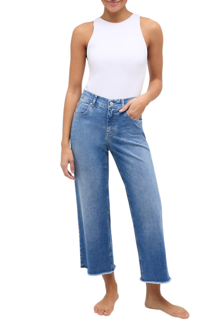 Эти укорочённые джинсы воплощают в себе сочетание комфорта и стиля. Широкие штанины и необработанный край придают модели особую небрежность и свободу. Светло-голубой оттенок позволяет легко комбинировать их с различными элементами гардероба. Петли для ремня и удобная застежка на пуговице завершают образ элегантностью и функциональностью, делая эти джинсы идеальным выбором для повседневных образов, которые всегда остаются актуальными.