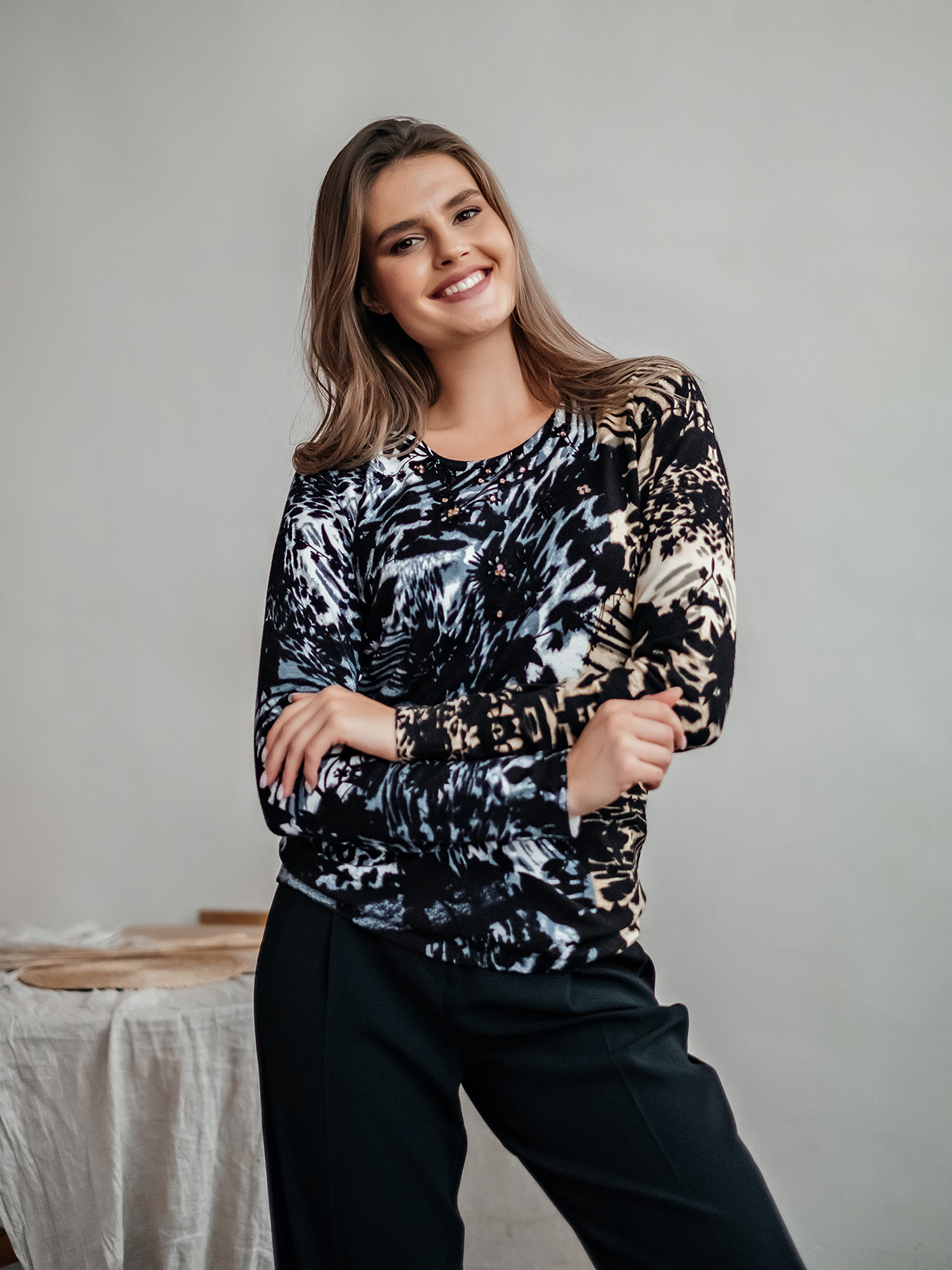 Теплый джемпер обращает на себя внимание благодаря цветочному принту в акварельном стиле. Прямой покрой, круглый вырез горловины, втачные рукава полной длины. Завершает изумительный дизайн декор из страз. Материал из вискозной смеси приятен к телу и обеспечивает комфорт.