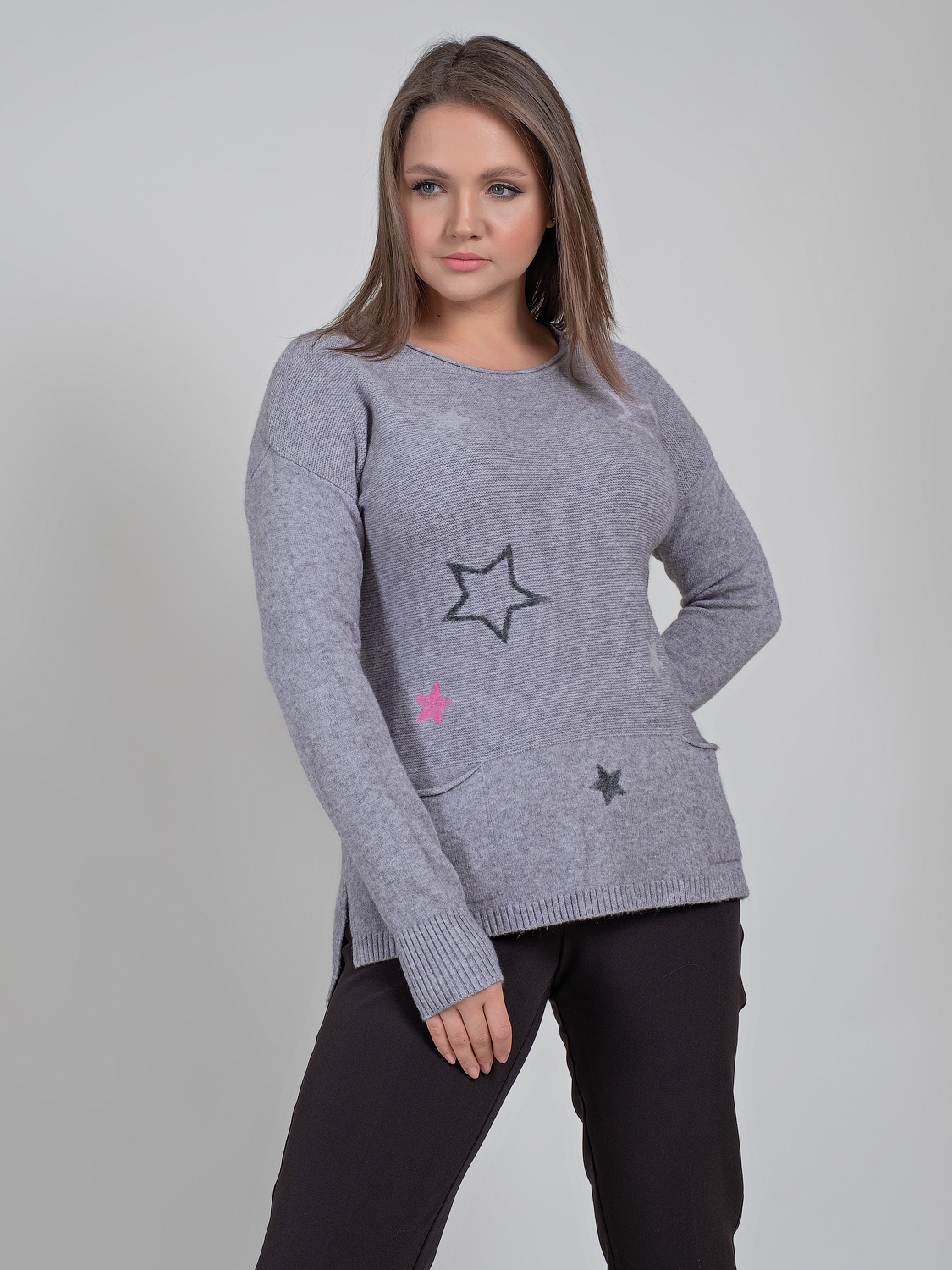 В мягком джемпер будет тепло и уютно холодной зимой. Оригинальный звездный принт придаст неформальность образу.Овальная горловина, втачной рукав полной длины со спущенным плечом, удлиненная спинка. Спереди имеется два накладных кармана.
