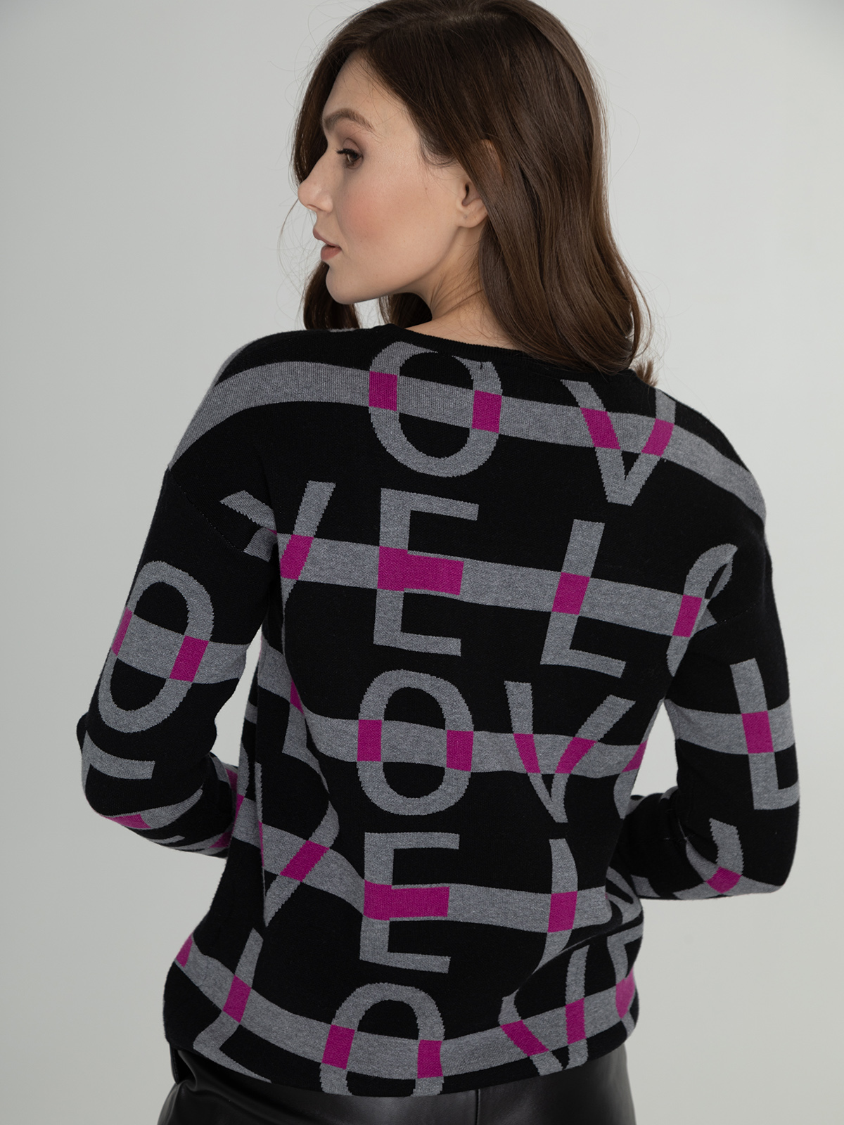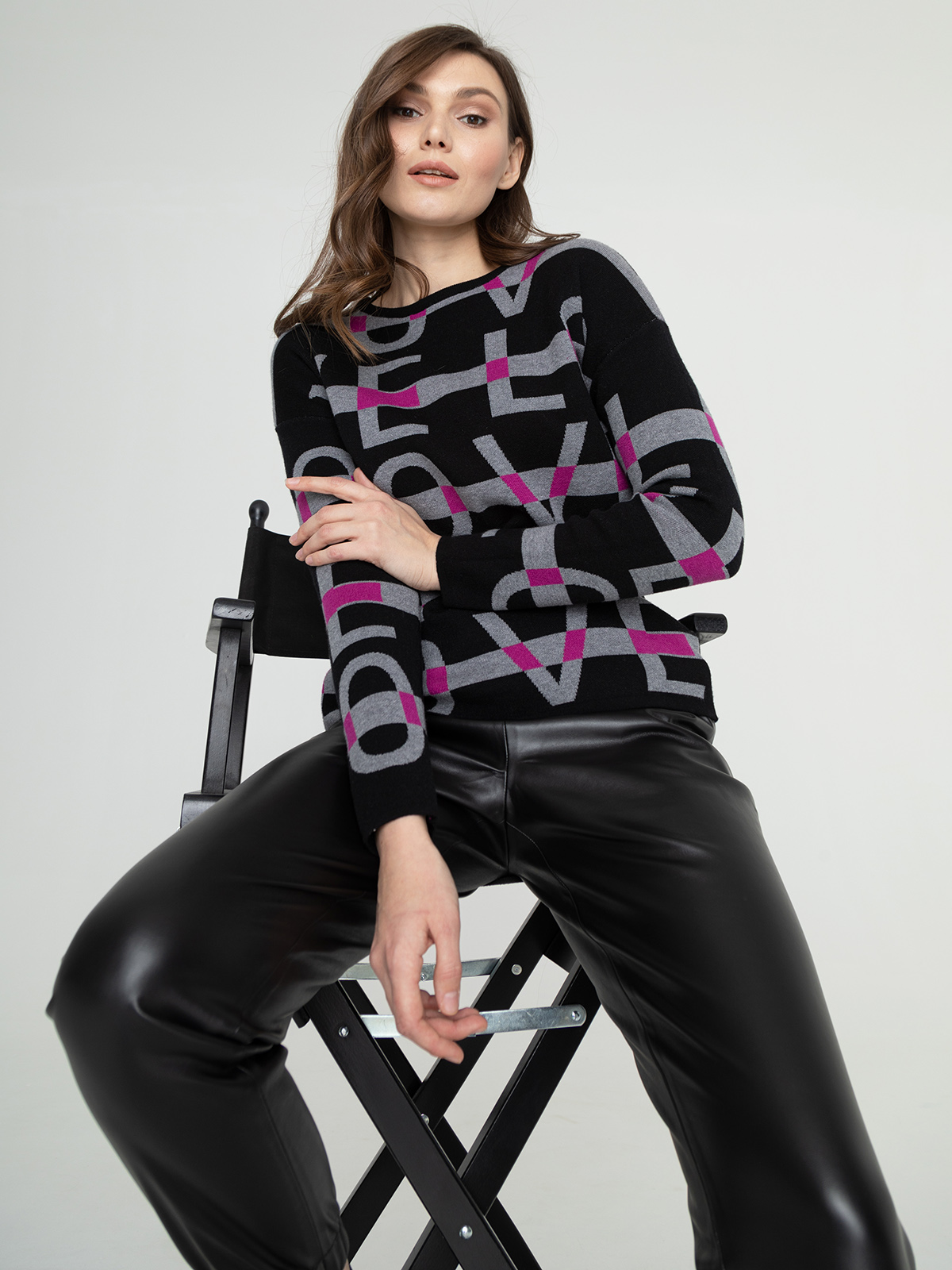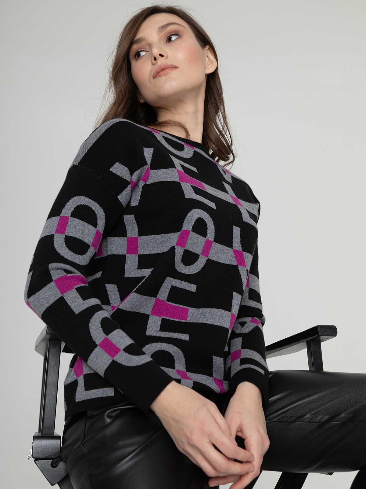 Оригинальный дизайн джемпера выполнен в контрастных цветах. Теплый материал идеально подойдет для холодной зимы. Джемпер прямого покроя с круглой горловиной и рукавом полной длины со спущеным плечом.