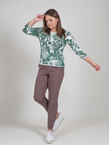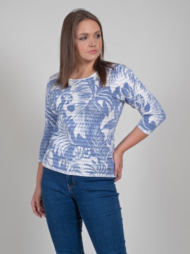 Легкий джемпер из 100%-го хлопка выполнен в тропическом узоре. Материал позволяет коже дышать, приятен к телу. Прямой крой скрывает недостатки фигуры и придает легкость силуэту. Втачной рукав 3\4 оголяет предплечья и визуально стройнит силуэт. Горловина-лодочка выгодно подчеркивает изящество линии шеи. Футболку можно как заправить под юбку или брюки, так и носить навыпуск.