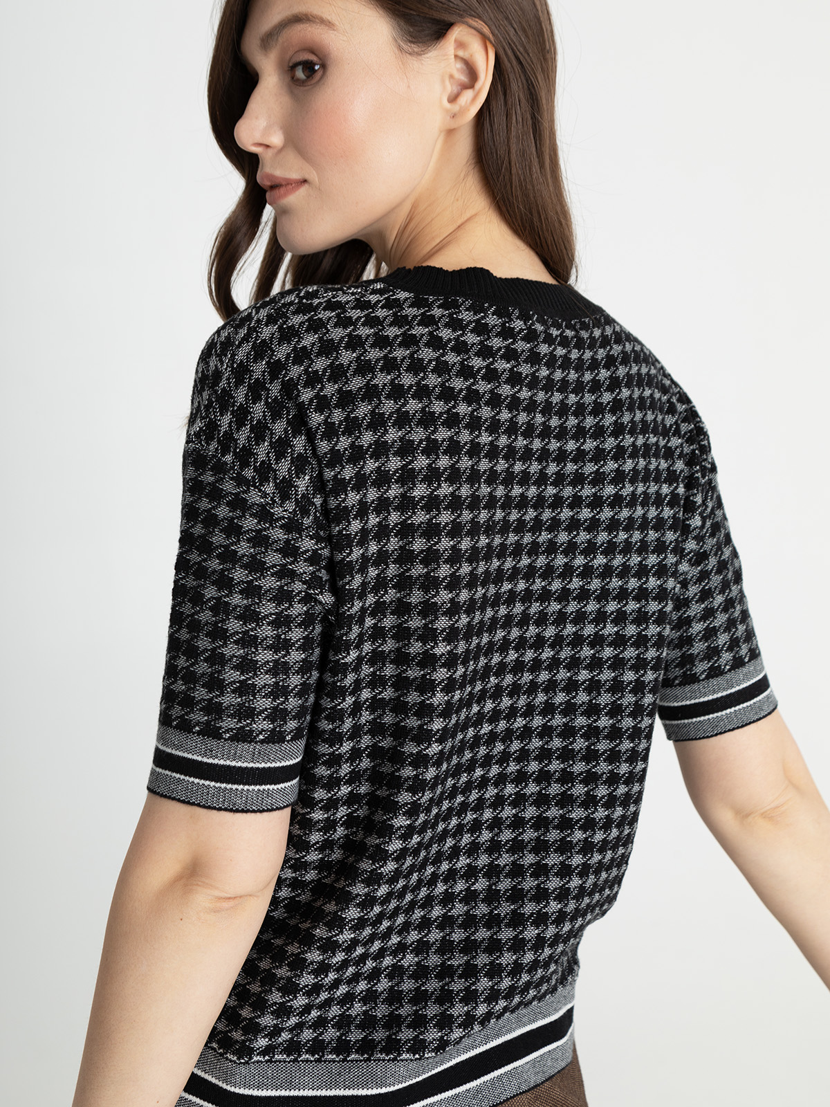Джемпер прямого кроя с узором гусиная лапка по всей поверхности изделия. Короткий втачной рукав, спущенная линия плеч. Круглый вырез горловины, обрамлен черной бейкой в рубчик.