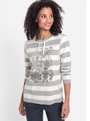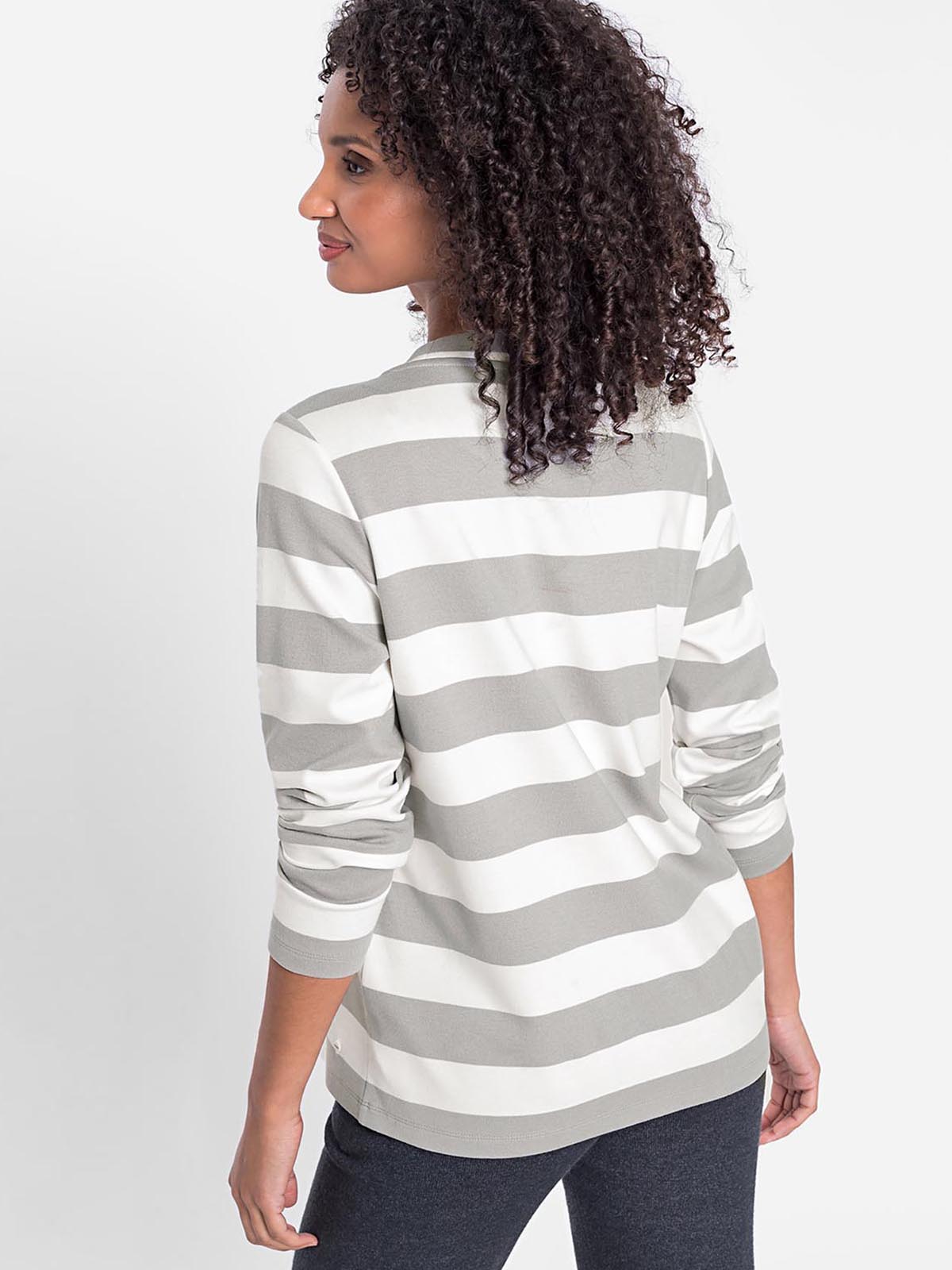 .Джемпер прямого кроя в широкую бело-серую полоску. Прямой силуэт, круглый вырез горловины. Спереди изящный, женственный узор.