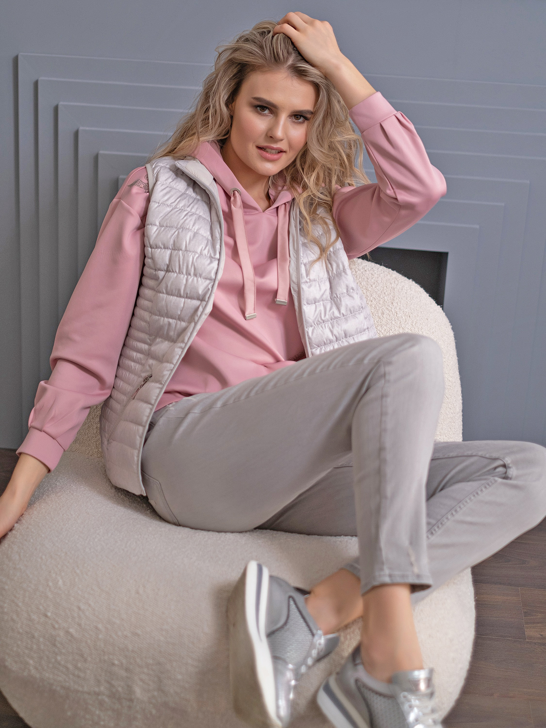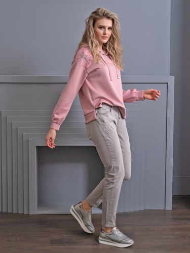 На сайте указаны Российские размеры. Толстовка выполнена в нежно-розовой расцветке и украшена декором в виде страз. Капюшон регулируется кулиской. Втачной рукав полной длины со спущенной линией плеч. Эластичная лента по низу изделия. Толстовка прекрасно дополнит джинсы или юбку-миди.