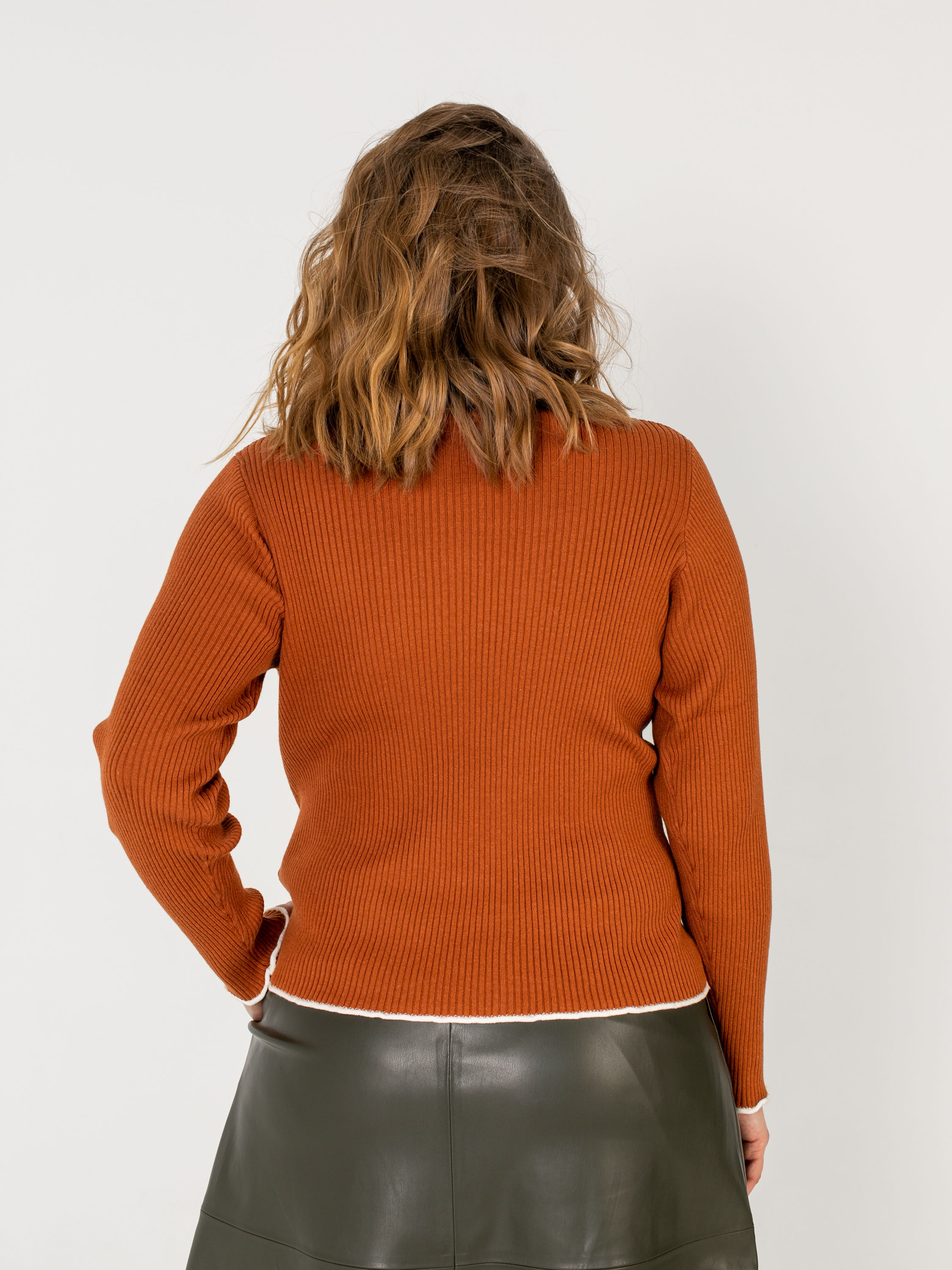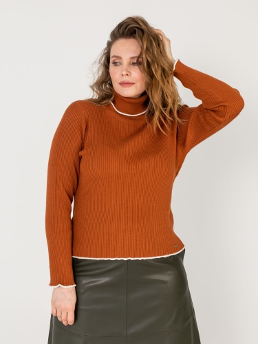 На сайте указаны российские размеры. Ткань: 50% хлопок, 50% акрил. Крой: однотонный джемпер-водолазка с высоким горлом в мелкий рубчик. Приталенный силуэт подчеркивает красоту фигуры, но благодаря достаточной плотности материала ее возможные недостатки не выглядят так явно. Прикрывает зону живота, не поднимается вверх при движении. Джемпер представлен в двух стильных оттенках – кирпичном и синем электрик. Отделка: ворот и рукава отделаны белой волнистой канвой, которая смотрится свежо и контрастно. Идеальный партнер для синих джинсов или темных брюк из коллекции Stern.