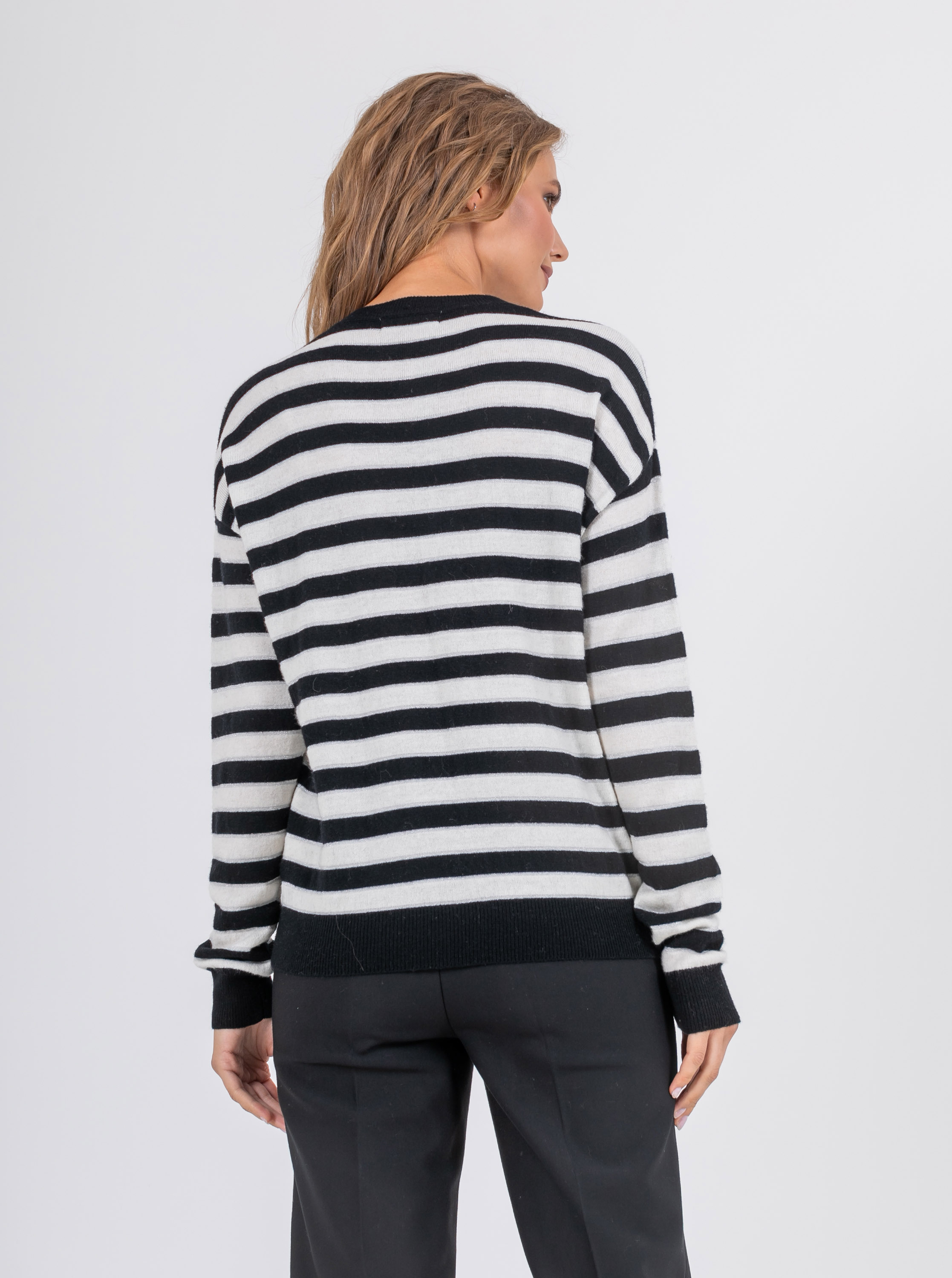 На сайте указаны российские размеры. Ткань: выполнен из 100% шерсти, которая прекрасно сохраняет тепло, пропускает воздух и впитывает влагу. Крой: классическая удлиненная модель свободного силуэта с длинными рукавами и круглым горлом. Слегка опущенная зона рукава обеспечивает максимальный комфорт и свободу при движении. Универсальная модель, подходящая женщинам с разным типом фигур. Отделка: отделка резинкой на манжетах и низе джемпера обеспечивает плотное прилегание, изделие не поднимается вверх и не открывает зону живота. Джемпер из мягкой шерсти в классическую черно-белую полоску создает французский шик. Прекрасно сочетается с джинсами, классическими и зауженными брюками, юбками А-силуэта и юбками-карандаш, шортами и кюлотами.
