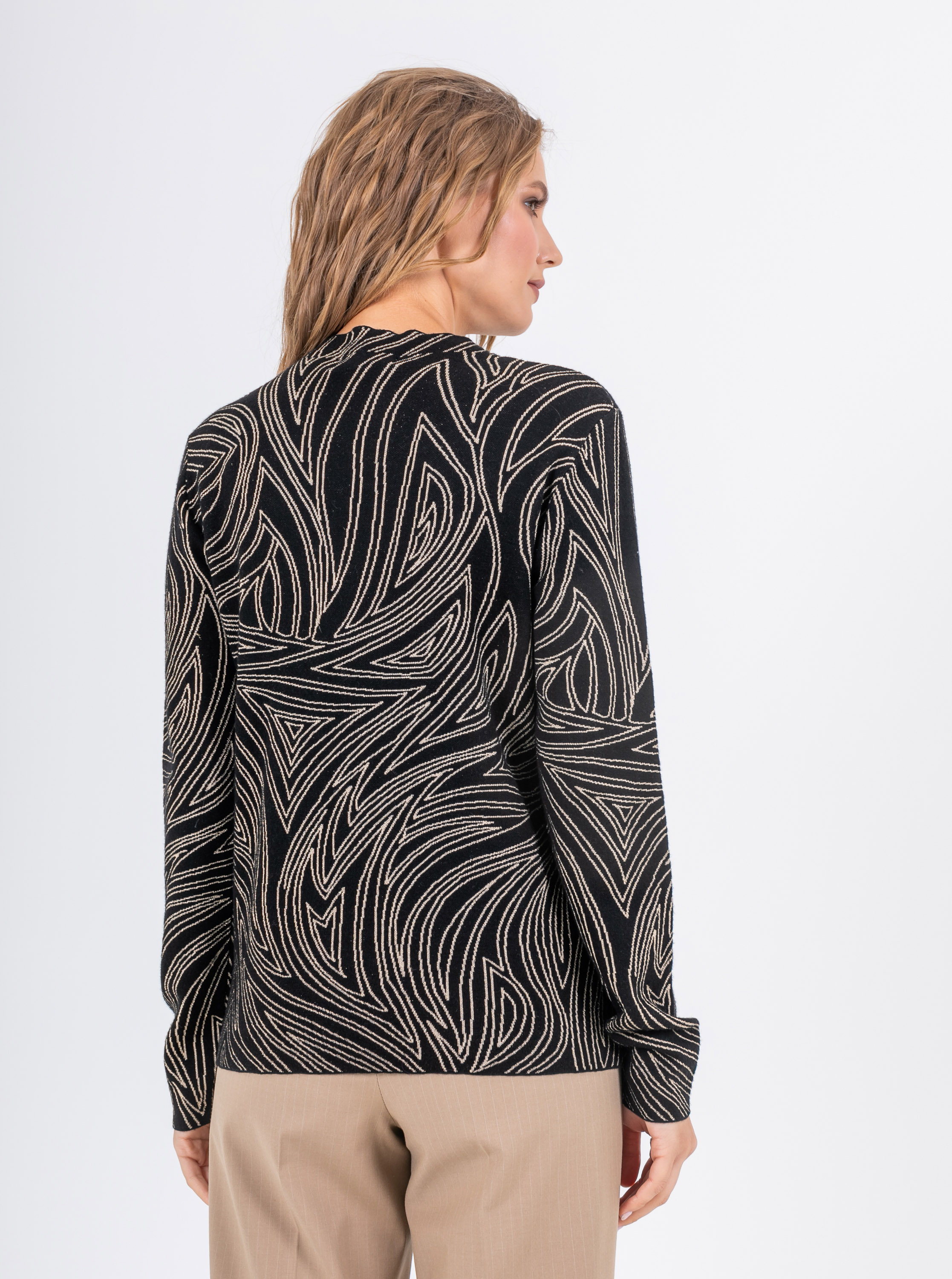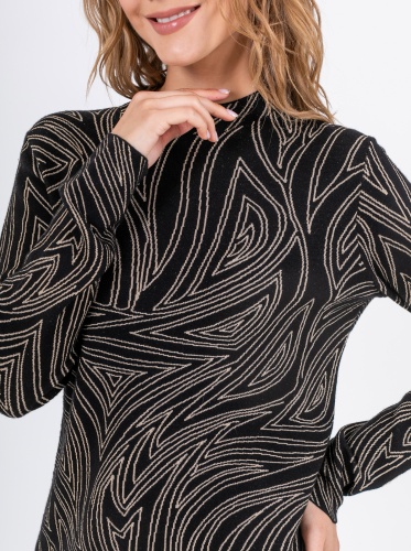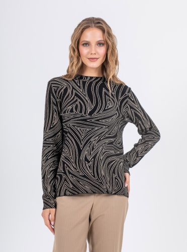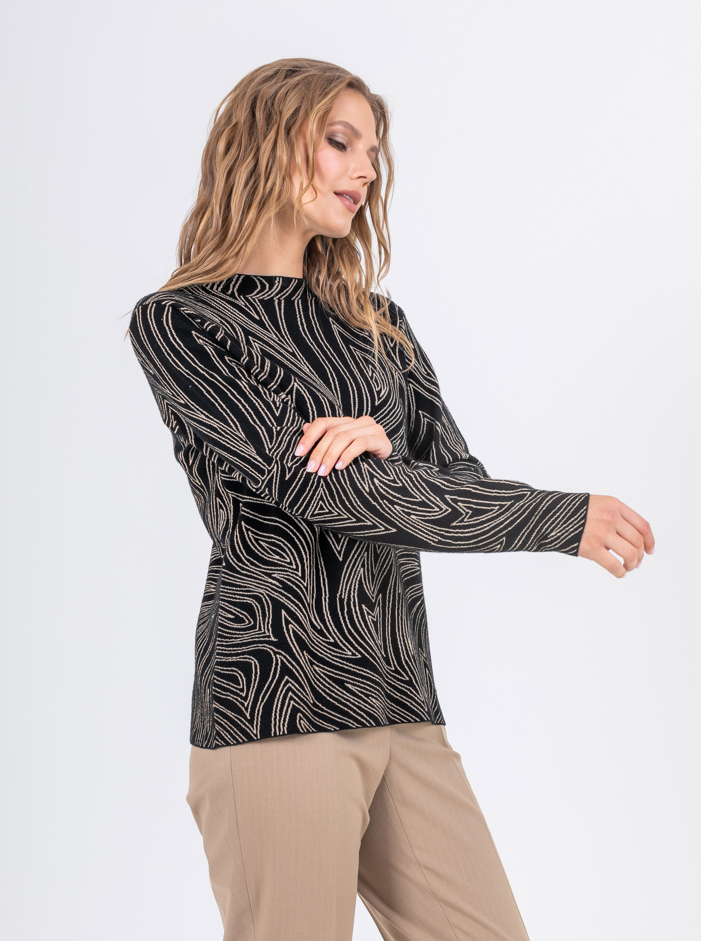 На сайте указаны российские размеры. Ткань: выполнен из смесовой ткани средней плотности. В составе высококачественная овечья шерсть (79,2%) для непревзойденного тепла, нейлон (13,4%) и полиэфирное пленочное волокно (7,4%) для эластичности. Крой: слегка приталенный женственный джемпер средней длины. Модель с удлиненными рукавами и воротом идеально садится по фигуре, подчеркивая ее достоинства, дарит мягкое тепло и уют. Свободные рукава дарят комфорт и не сковывают движения. Длину рукава можно регулировать подгибкой. Отделка: абстрактные узоры на ткани делают образ интересным и запоминающимся. Поддержите лаконичность образа юбками и брюками черных или бежевых оттенков в цвет узора.