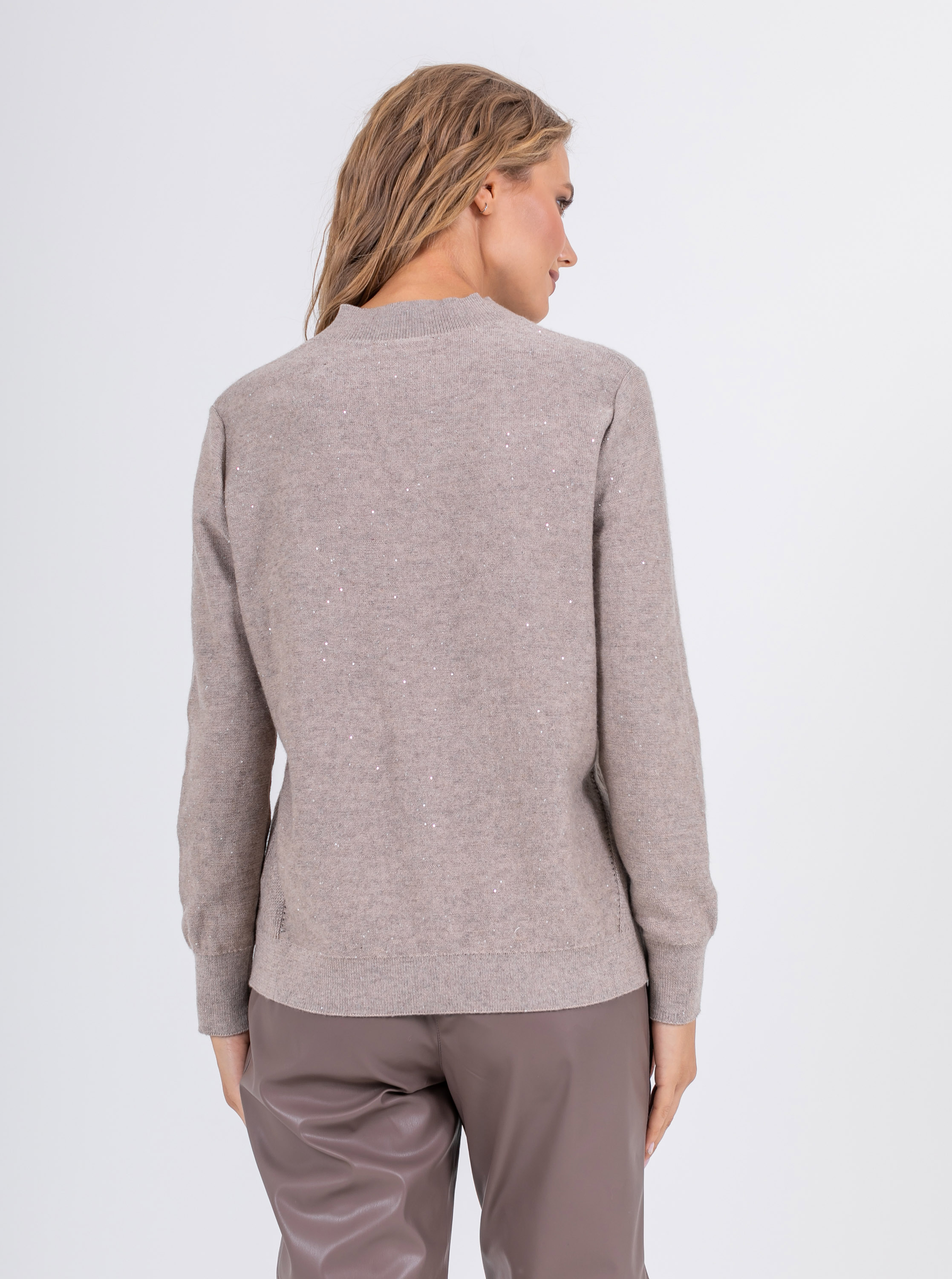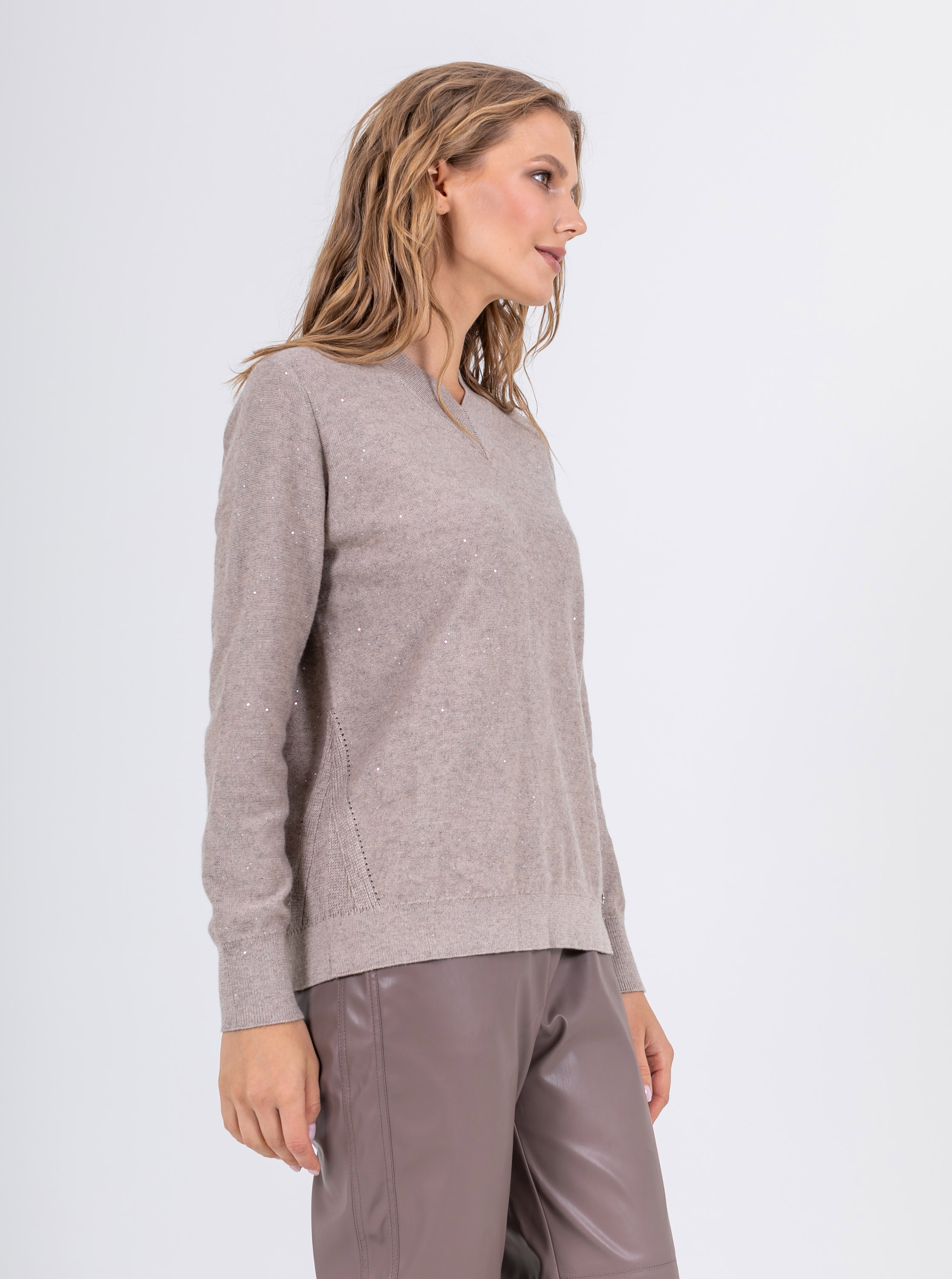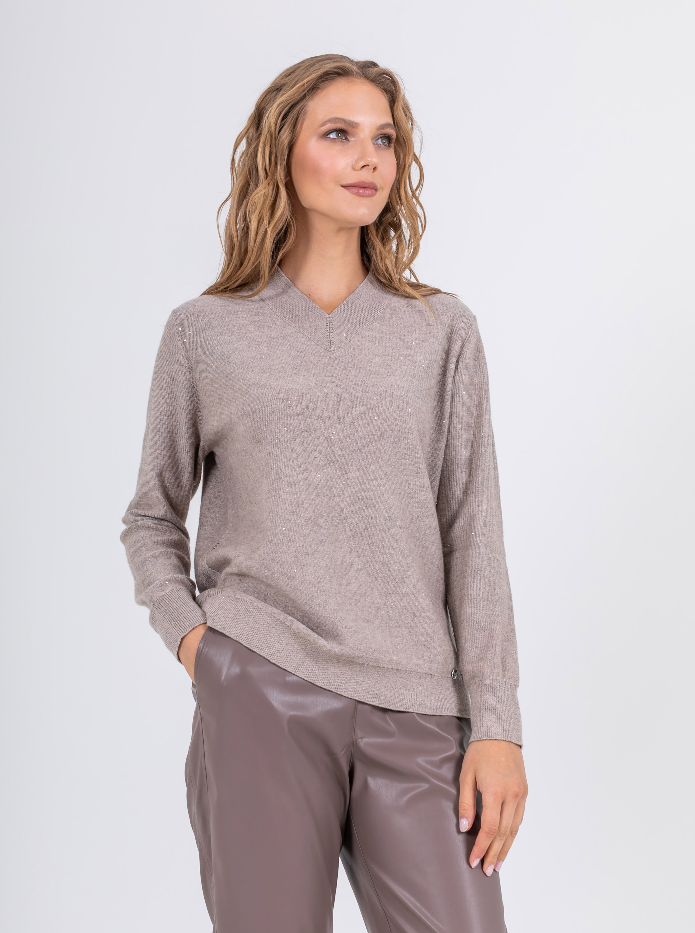 На сайте указаны российские размеры. Ткань: смесовая ткань средней плотности (5% кашемир, 10% шерсть, 30% вискоза, 55% нейлон). Отделка: базовый вязаный джемпер прямого силуэта с длинным рукавом. Классический V-образный вырез подчеркивает красоту шеи и вытягивает силуэт, а еще дает возможность дополнять и усложнять образ однотонной футболкой или рубашкой под низ. Имеет достойную длину, которая закрывает зону живота и скрывает возможные особенности фигуры. Отделка: благородный пастельный оттенок дополняется едва заметным блеском от плоских пайеток, деликатно рассыпанных по поверхности. Боковая часть джемпера украшена художественной перфорацией и узором отличной от основной ткани фактуры. Сочетайте с различными моделями кожаных брюк из ассортимента Stern.