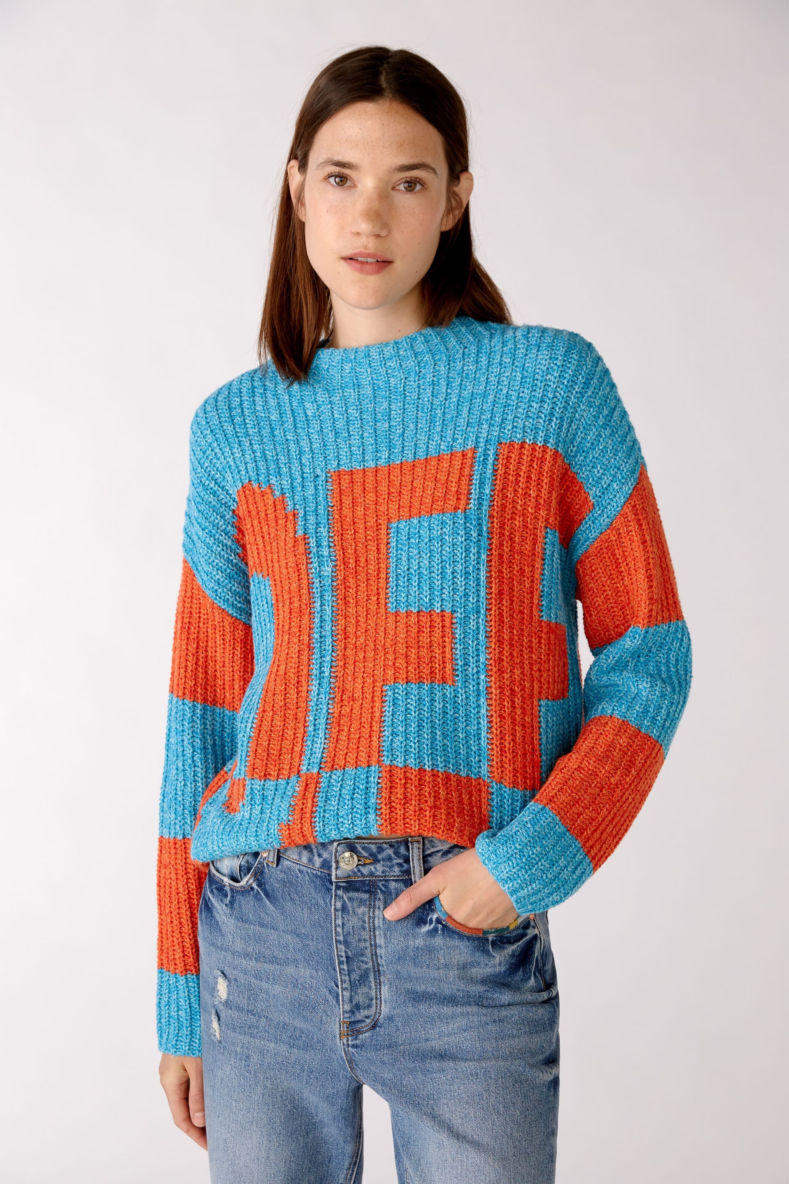 На сайте указаны российские размеры. Хлопковая смесь грубой вязки. Эффект цветных блоков в сочетании с пряжей мини-букле в стиле мулине. Покрой оверсайз со спущенными плечами. Неброские рукава и концы кромки.