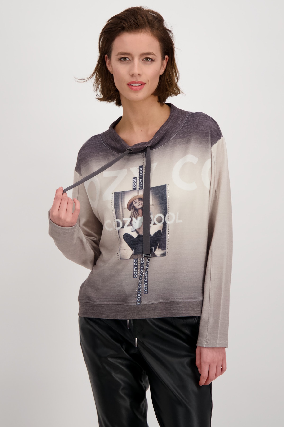 На сайте указаны российские размеры. Легкая толстовка с длинными рукавами, воротником-стойкой и принтом. Толстовка прямого кроя, воротник-стойка с люверсами и завязками, слегка приспущенная линия плеч и широкая манжета по низу. Красивый сплошной цветовой градиент прерывается фотопечатью с деталями в виде букв и сверкающими стразами спереди. Идеально сочетается с женственными кожаными брюками и крутыми черными ботинками. Модель ростом 178 см. Длина спины 44 размера 58 см.