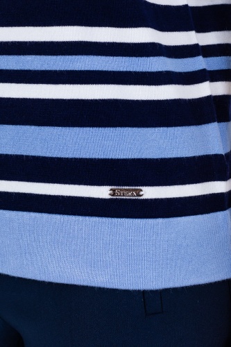 На сайте указаны российские размеры. Джемпер средней длины прямого силуэта из легкой, мягкой вискозы с добавлением нейлона, дизайнерская особенность модели – принт в полоску. Втачные рукава ¾. Воротник «хомут» с декоративной петелькой.