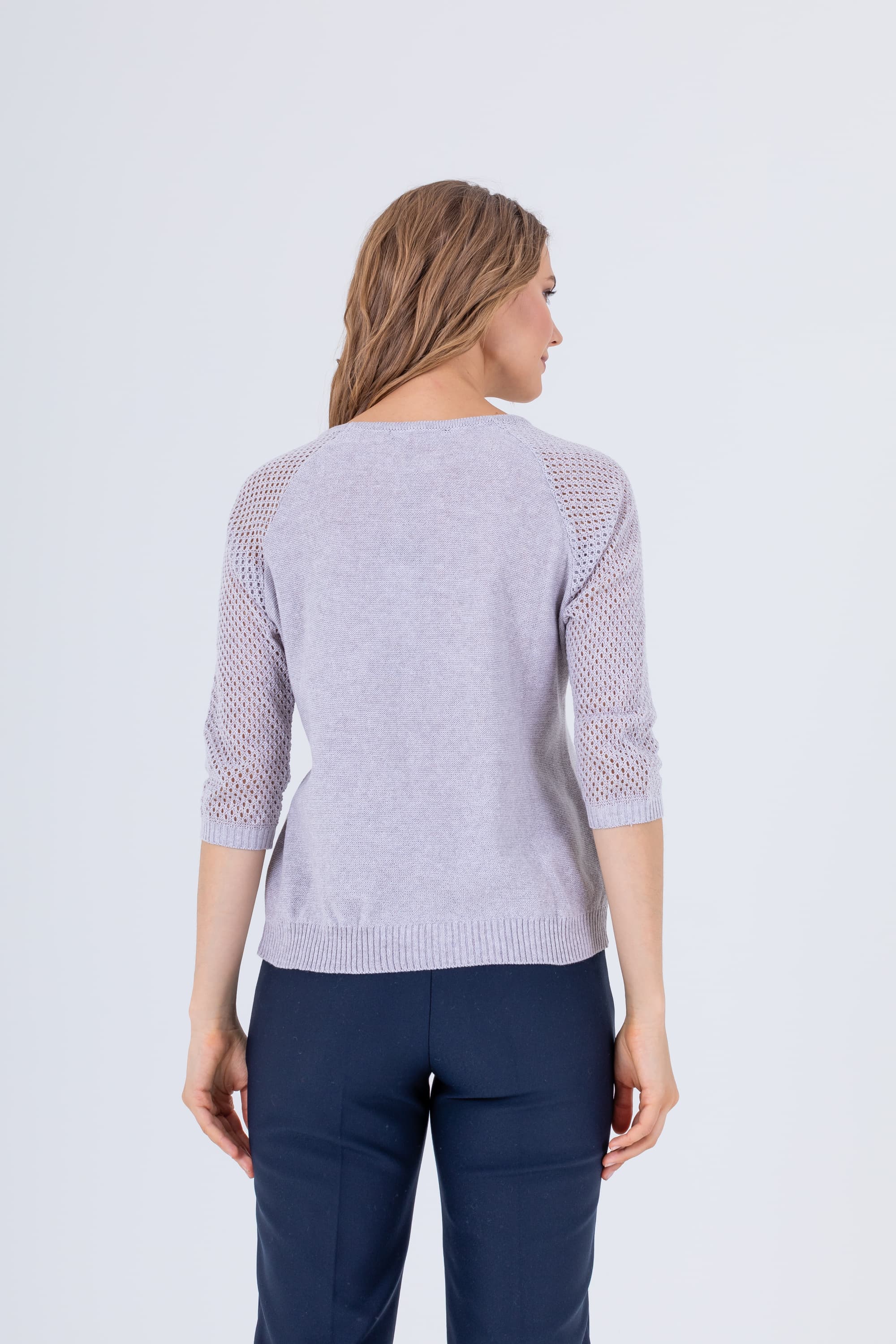 На сайте указаны российские размеры. Джемпер средней длины прямого силуэта из легкого хлопка с добавлением полиакрилонитрила, дизайнерская особенность модели – ажурный трикотаж на рукавах. Перед и спинка по низу обработаны манжетой. Рукава реглан ¾ с манжетами. Круглый вырез горловины.