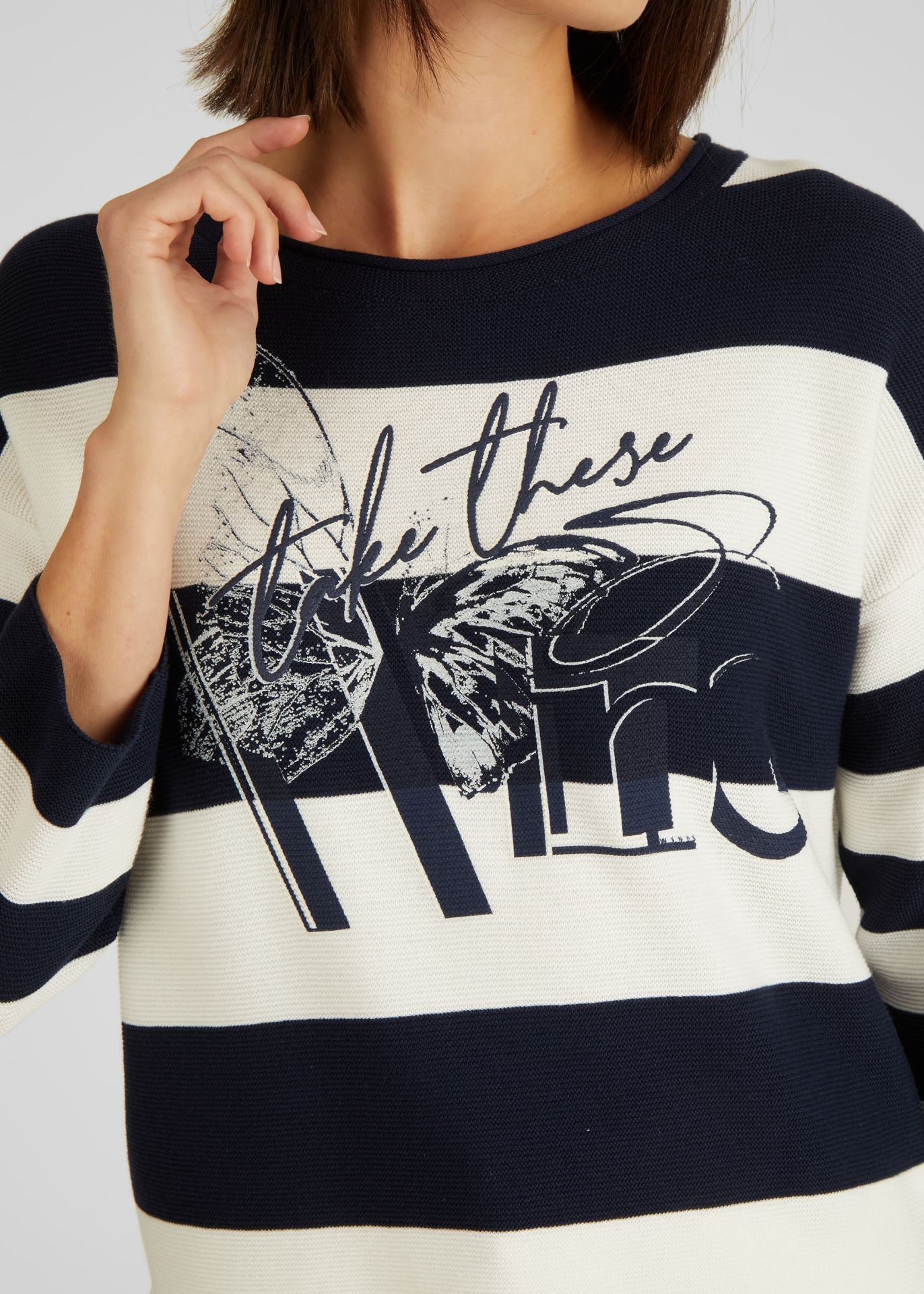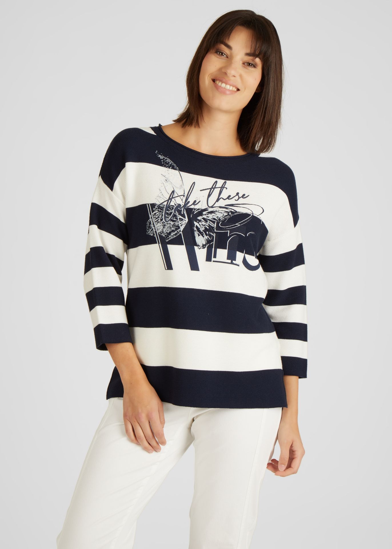 На сайте указаны российские размеры. Этот вязаный свитер с рукавами 3/4 привлекает своим абстрактным мотивом. Абстрактный мотив с буквами слегка выделяется на полосатом фоне и придает свитеру современный вид. Длина по спинке от плеча для размера 46: 62 см. Рост модели 176 см.
