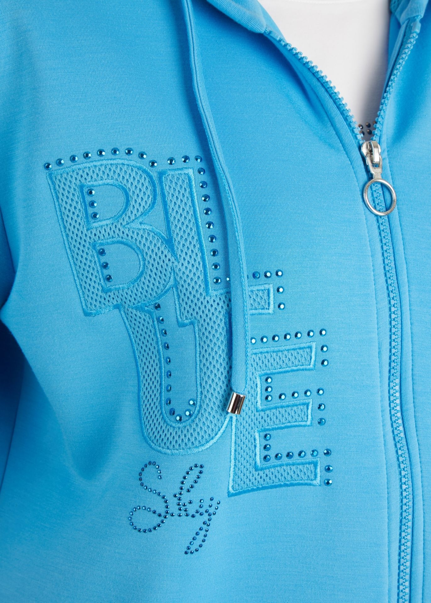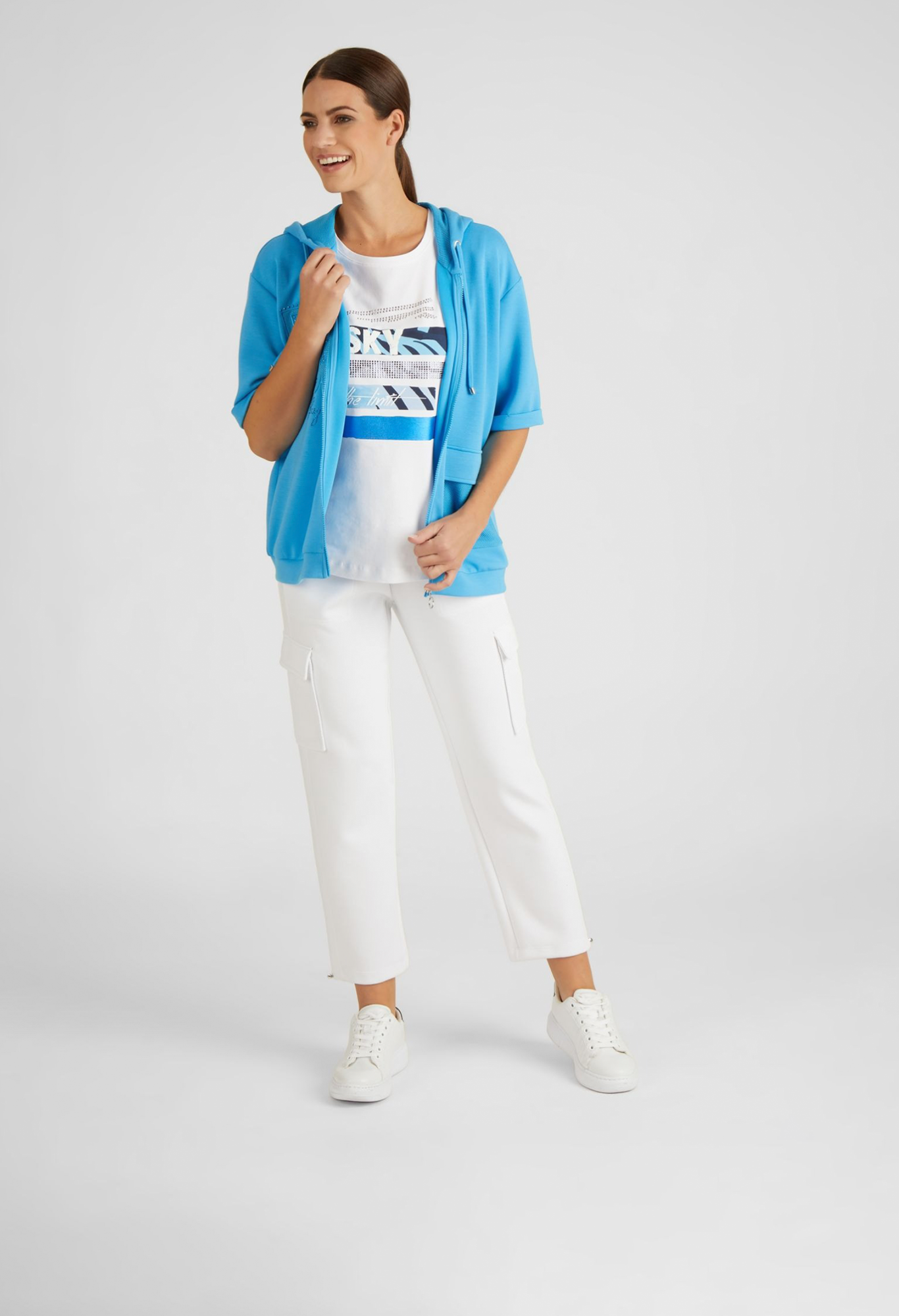 Эта модная толстовка с короткими рукавами, капюшоном и завязками подойдет для любого случая. Однотонная куртка имеет молнию. Особого упоминания заслуживают элегантные детали: вышитая надпись и стразы украшают переднюю часть куртки. Практичный накладной карман завершает дизайн. Толстовка – настоящий маст-хэв для женщин, следящих за модой. Длина по спинке от плеча для размера 46: 62 см.